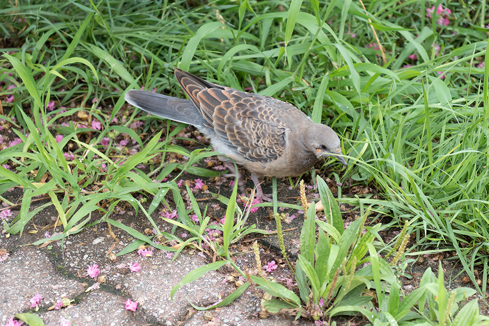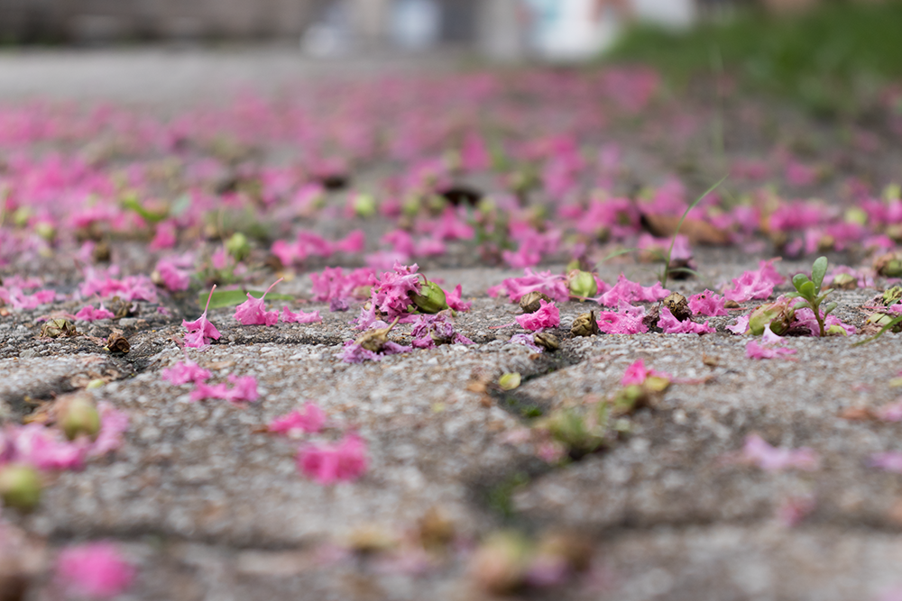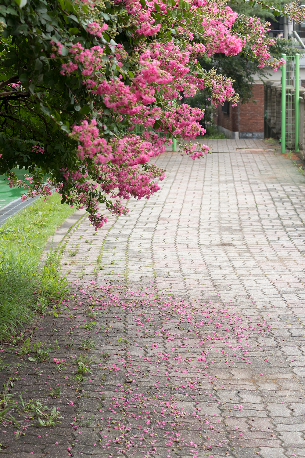 보도블럭 위로 떨어진 배롱나무 꽃의 느낌이 우중충하게 흐린 날씨와도 잘 어울리는 모습이다.