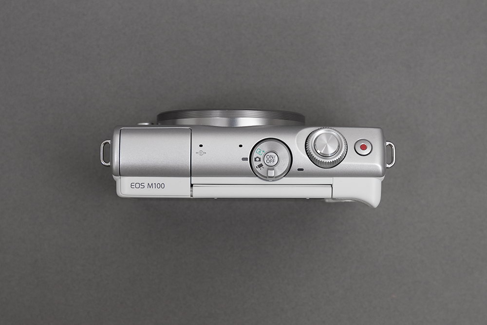 외형은 다이아몬드 패턴이 적용됨으로써 밋밋함을 없앤 디자인과 동시에 조금 더 개선된 그립감을 느낄 수 있습니다. CANON, 그리고 EOS라는 레터링 외에 M100 모델임을 알리는 디자인적인 특징이라고도 볼 수 있습니다.