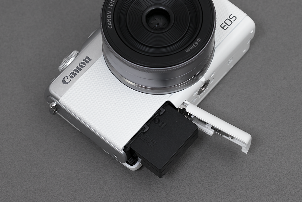전용 배터리 LP-E12와 SD카드는 각각 하단과 측면으로 장착이 가능한 형태로 구성되어 있으며 최대 촬영 가능 매수는 CIPA 기준 최대 촬영 매수가 약 295매 소폭 향상되었음을 알 수 있습니다. 이는 최근에 선보이고 있는 캐논 DSLR, 미러리스 카메라에서도 확인할 수 있는 부분으로 배터리 효율이 증대되었음을 나타내기도 합니다.