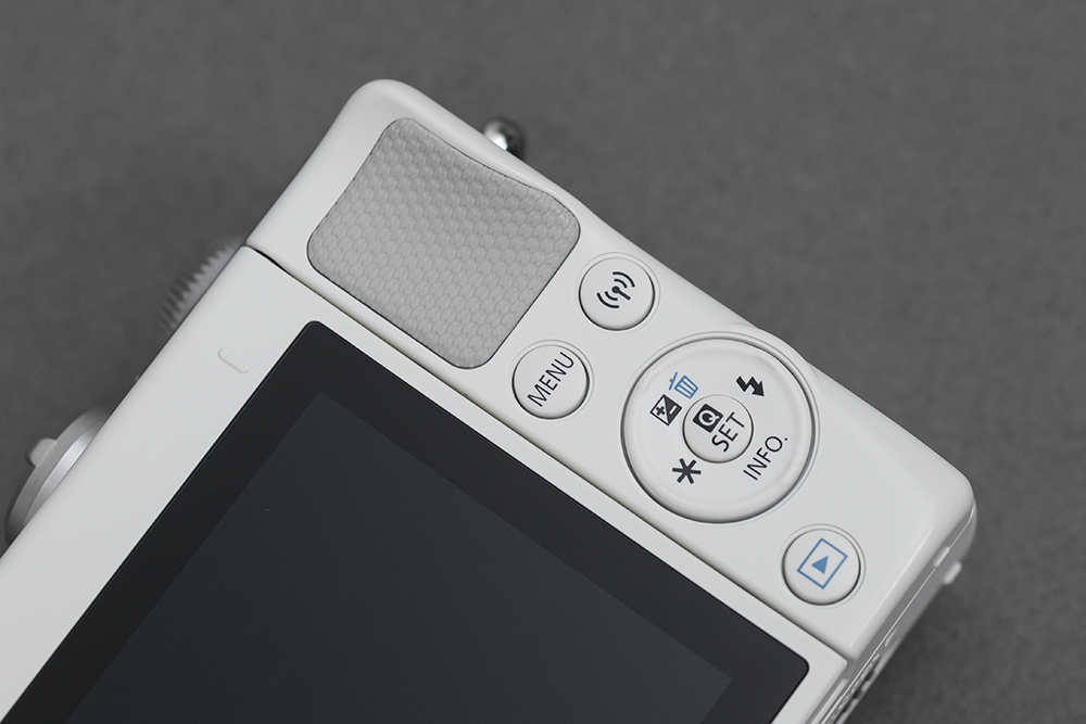 또한 전면의 다이아몬드 패턴과 함께 그립감을 향상시켜주는 고무 그립 외에 후면에는 다양한 기능을 제공하는 메뉴 버튼과 Wi-Fi 버튼 외에도 노출 보정, AE 잠금, 빠른 설정 메뉴, 플래시, 정보 및 재생 버튼을 제공합니다.