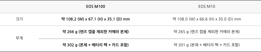 먼저 캐논 EOS M100은 캐논 EOS M10의 후속작이라고 할 수 있습니다. 휴대성이 꽤나 좋았던 EOS M10이었기에 EOS M100도 비슷한 크기나 무게를 유지하고 있는데요. 자릿수가 바뀐 네이밍에서 다소 의아한 모습을 보이기도 합니다. 하지만 세상에서 가장 가벼운 DSLR을 표방하는 EOS 200D와 마찬가지로 미러리스 보급기에는 EOS M100이 포지셔닝되는 것 때문이 아닐까 조심스레 예측해 볼 수 있겠네요.