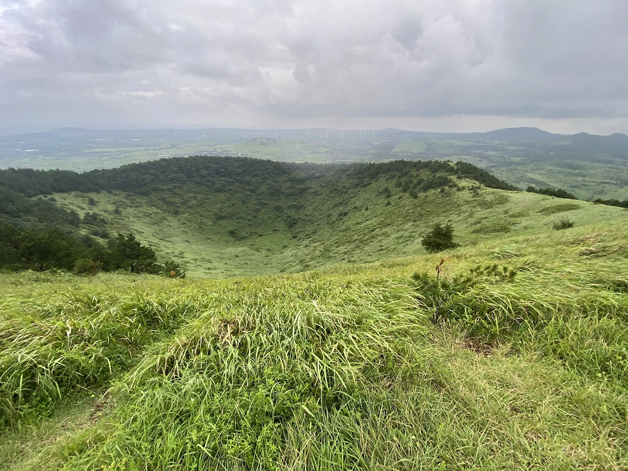 시간상, 체력상으로 다랑쉬오름에 올라갔다 와야 딱 좋은데 비가 올 것처럼 날씨가 어두워진다. 망설이다 우산 들고 오르기 시작했다. 다랑쉬오름은 다른 오름에 비해 높고 큰 편이며 오름의 여왕이라고 불릴 만큼 위엄 있고 아름답다. 처음 오를 때는 경사가 있는 편이지만 지그재그로 되어있고 바닥에는 멍석이 잘 깔려있으며 옆에 손잡이도 있어서 어렵지 않다. 화구는 달처럼 동그랗게 되어있어서 빙 돌아보는 재미가 좋다.