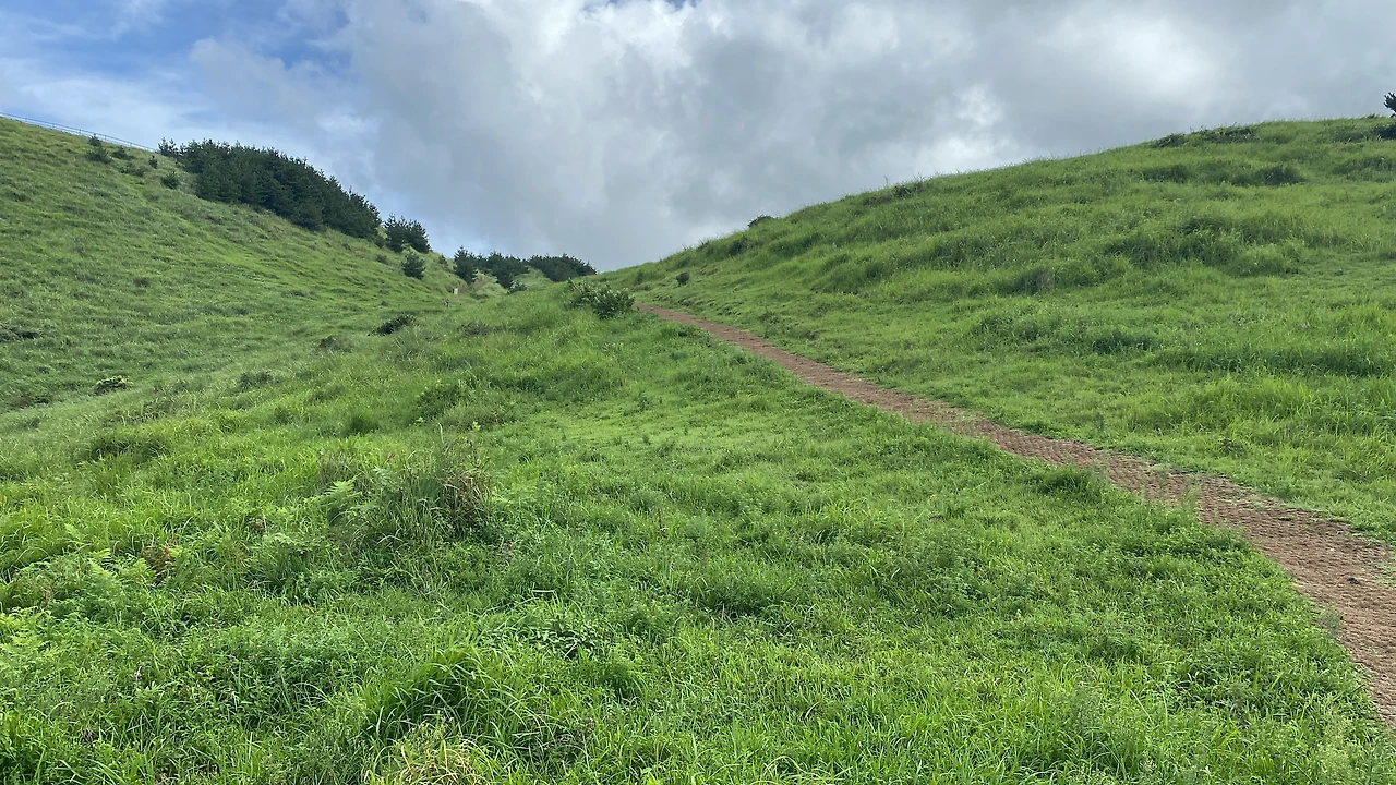 용눈이 오름은 제주도의 360여 개 오름 중 유일하게 분화구가 3개이다. 분화구가 용이 누웠던 자리 같기도 하고, 용의 눈 같기도 해서 용눈이 오름이라고 한다. 3개의 능선이 이어져 있어 구불구불해서 오르는 재미도 있고 남녀노소 누구나 오를 수 있을 만큼 완만해서 콧노래가 나온다. 능선은 누워서 굴러도 될 것처럼 부드러운 초록 풀 양탄자가 깔려있다. 가을, 겨울에는 갈대로 덮인다고 한다. 정상에 서서 빙 둘러보면서 와! 감탄사를 연발했다. 우도, 성산일출봉까지 다 보인다. 바로 옆에 있는 다랑쉬 오름이 유혹한다.