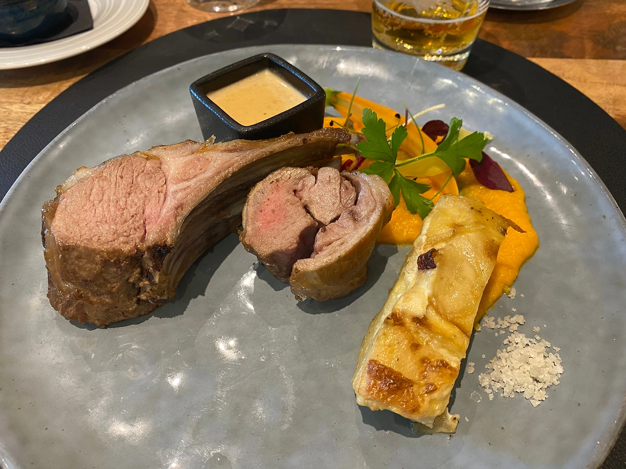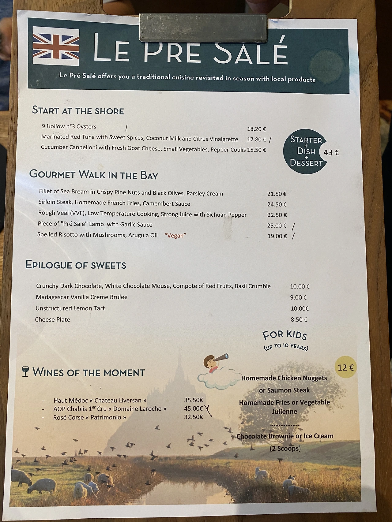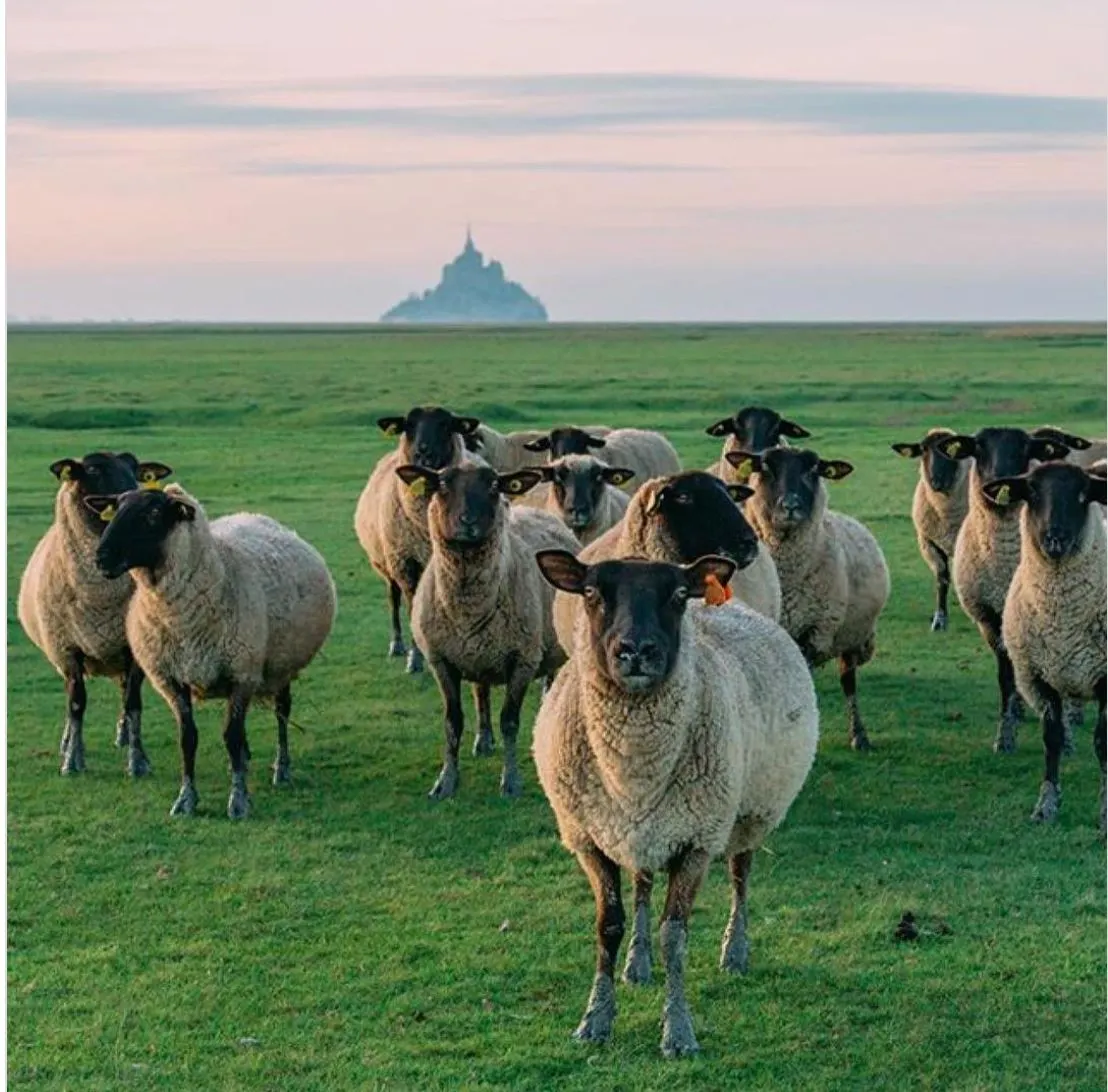 몽 생 미셸 주변에서 자라는 풀은 염분과 미네랄이 풍부한 바닷물을 흡수해서 이를 먹고 방목으로 자란 양의 고기(프레 살레 양고기 Agneau de pré salé)는 맛이 좋기로 유명하다. 미리 예약해 논 레스토랑에서 맛보았다. 갯벌 초원에서 풀을 뜯는 양을 봐서 기분은 좀 별로였지만(양들에게 미안) 양고기는 감칠맛이 났고 부드러웠다.