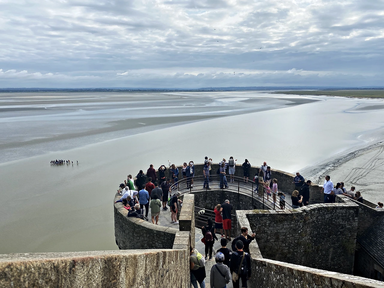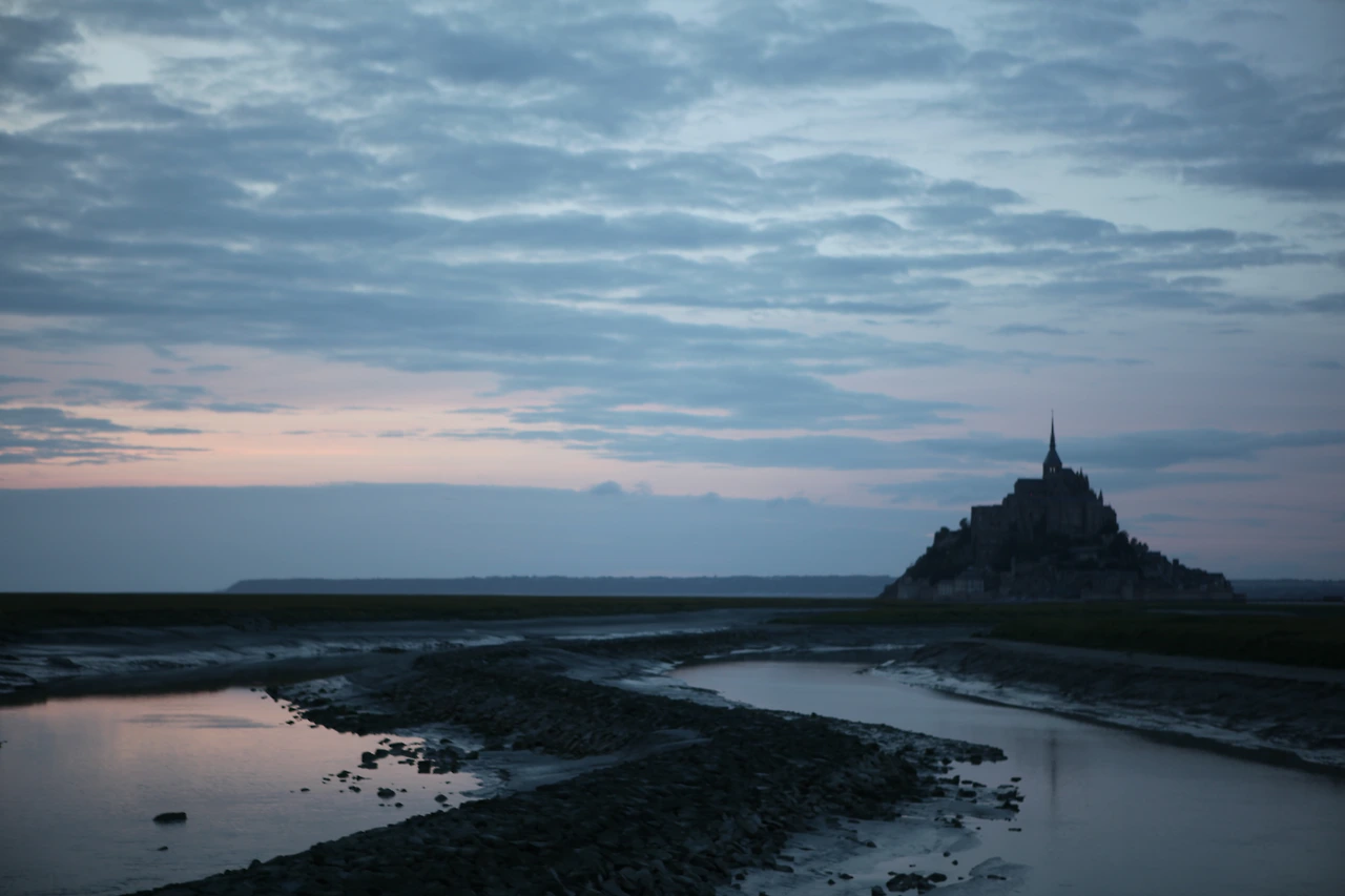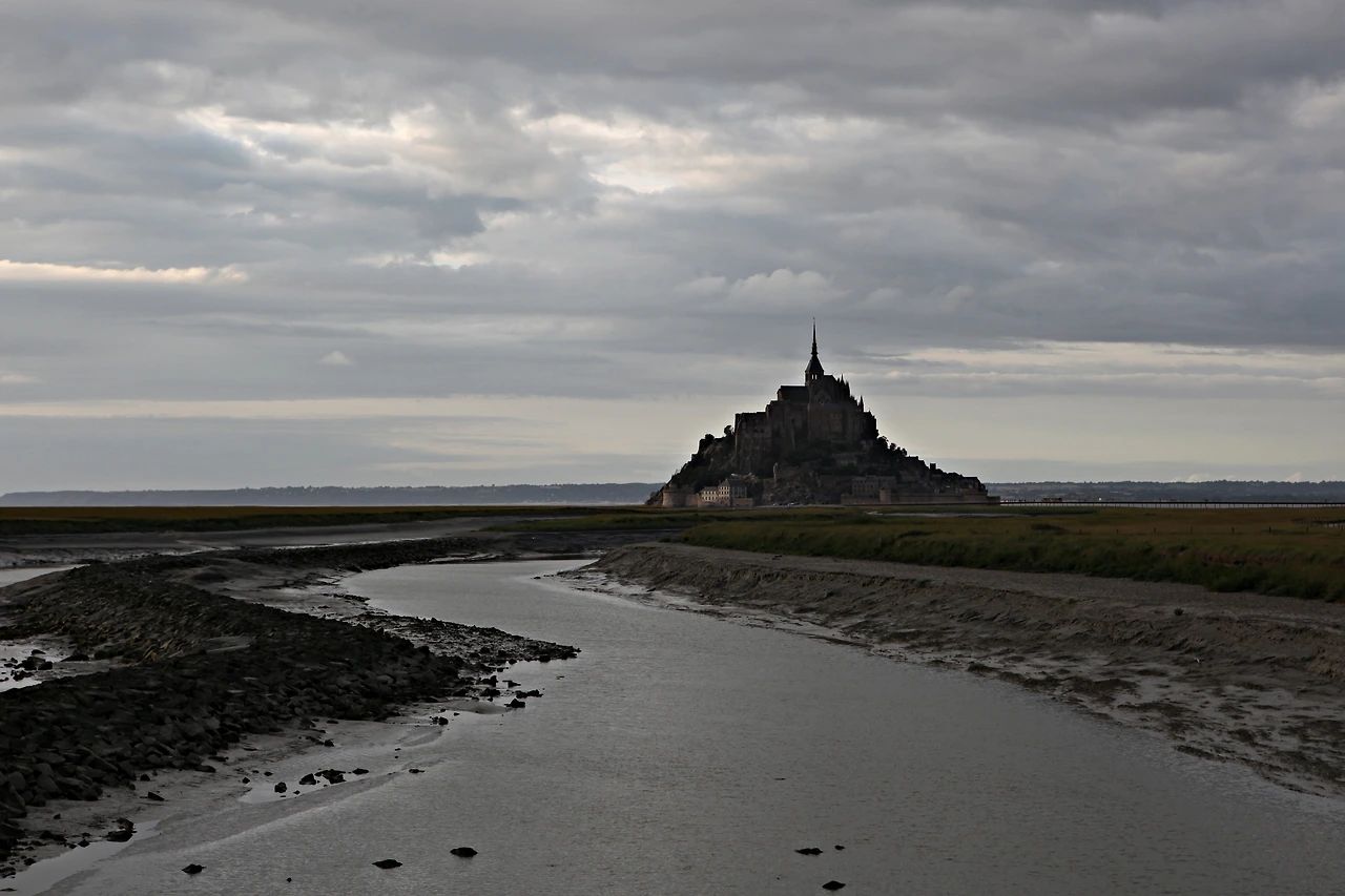 하루 두 번 만조 시에는 몽환적인 섬이 되고 간조 시에는 모래밭을 걸어 들어갈 수 있다. 수위가 최고 14m까지 올라가는 만조 시에는 위험하다지만, 2015년에 건설된 공중 다리가 있어서 언제든지 들어갈 수 있다. 공중 다리를 거부하고 고운 모래를 밟으면 걸어 들어갔다. 걸어 들어갈수록 몽생미셸은 거무슬르름한 공기속에 휩싸이는데 예쁜 일몰은 쉽게 나타나 주지 않았다. 사춘기 소녀 볼처럼 하늘이 붉으래 하더니 서늘한 바람과 함께 금방 사라졌다.