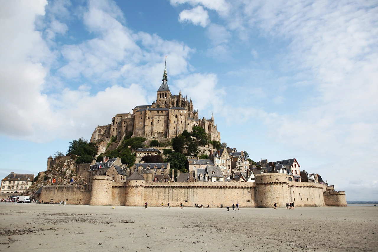 파리에서 400km 정도 떨어져 있어 서두르면 당일치기도 가능한 곳이다. 멀지 않은 곳에 코끼리 절벽 에트르타나 관광항구 옹플뢰르가 있어 1박 2일로 계획했다. 노르망디 지역의 광활한 들판과 예쁜 집들을 구경하며 가다 보면 초원 끝에 조그마한 삼각뿔, 몽 생 미셸이 보이기 시작한다. 초원에 양들이 한가롭게 풀을 뜯고 있고 넓은 갯벌은 몽 생 미셸을 더 돋보이게 한다.
