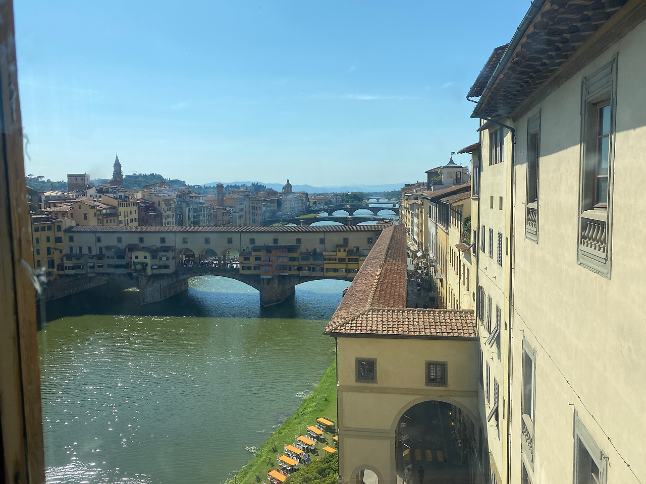 우피치 미술관 2층에서 아르노강과 베키오 다리까지 볼 수 있다. 우피치 미술관 관람을 마치고 나니 큰 숙제를 끝낸 느낌이다. 박물관 미술관 관람은 늘 즐겁지만 너~`무 크면 힘들기도 하다. 내 기억으로 재밌고 의미 있지만 힘들었던 곳은 뉴욕의 메트로폴리탄 박물관, 파리의 루브르 박물관, 영국의 대영박물관, 스페인의 프라도 미술관, 이집트 박물관, 이탈리아 피렌체 우피치 미술관이다. 야호~ 우피치 미술관도 정복했다.