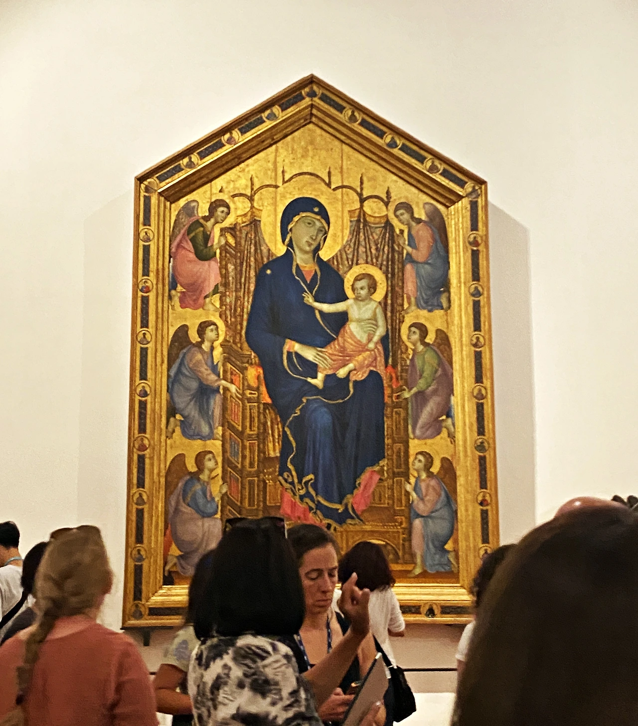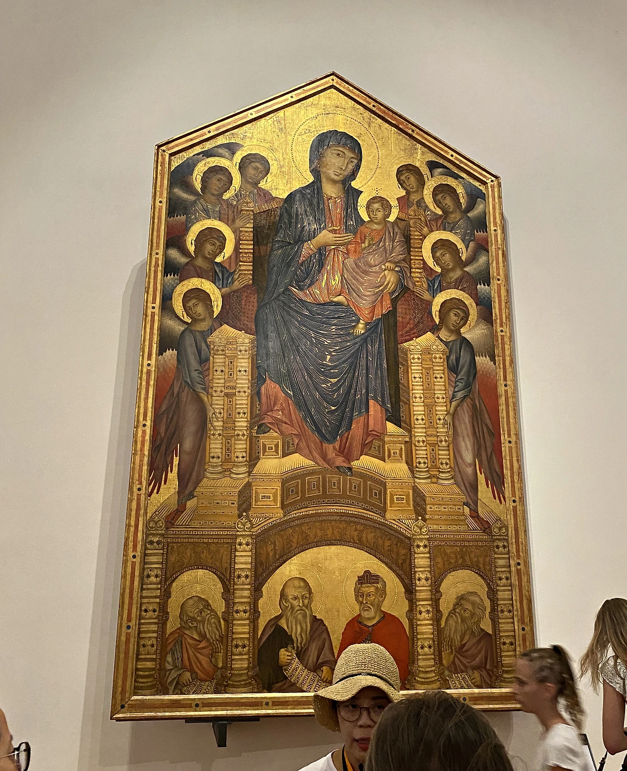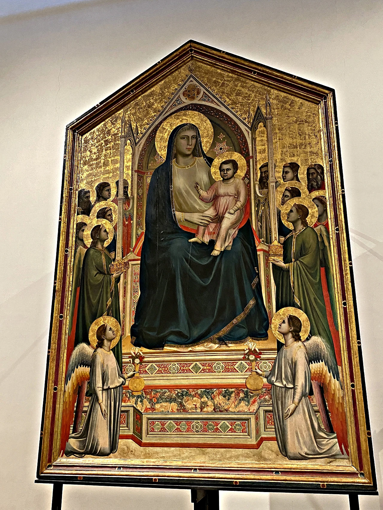 1. 두번째 작품이 지오토의 오그니산티 마돈나(Ognissanti Madonna 또는 Madonna Ognissanti)로도 알려진 Madonna Enthroned이다. 이탈리아 후기 중세 예술가 Giotto di Bondone의 나무 패널에 템페라로 그린 그림이다. 전통적인 기독교 주제인 마돈나와 아기예수를 표현하고 있으며, 성모와 그녀의 무릎에 앉은 그리스도 아기를 표현하고 있다. 스승인 첫번째 작품, 치마부에 마에스타의 영향을 받았다. 두초(Duccio di Buoninsegna)는 시에나 회화의 아버지이자 다른 이들과 함께 서양 회화의 창시자로서 손꼽힌다