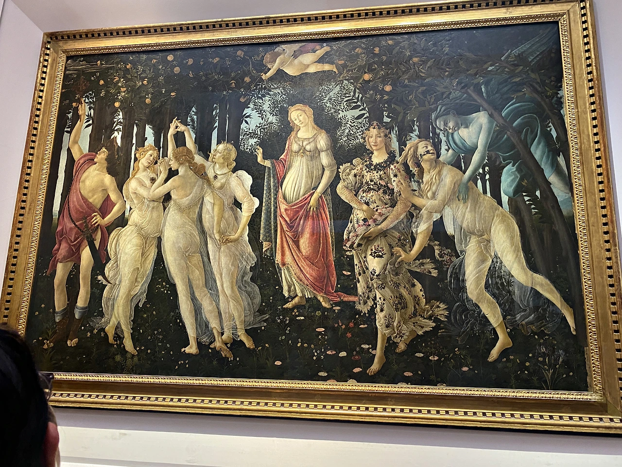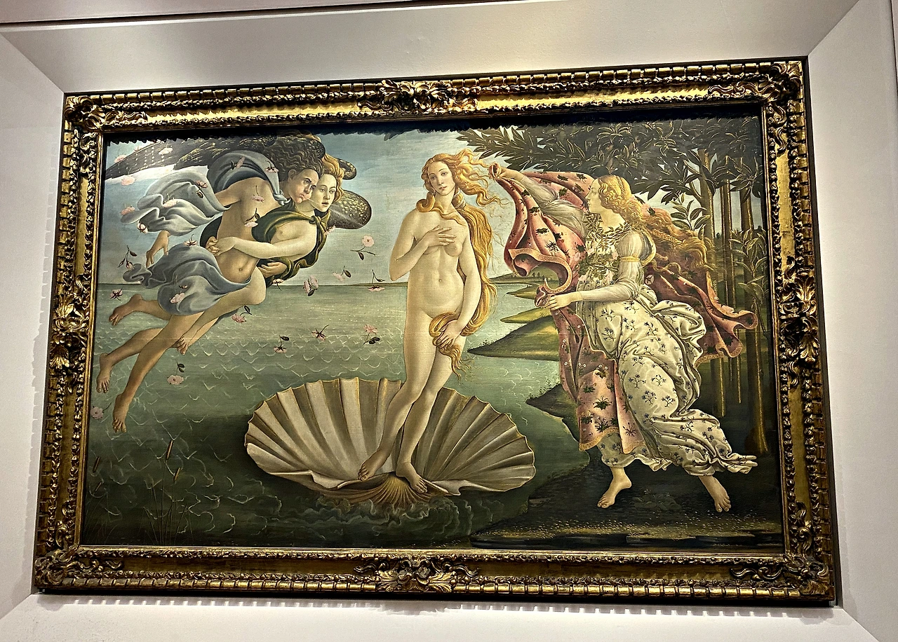 4. 산드로 보티첼리(Sandro Botticelli)의 비너스의 탄생(La nascita di Venere)이다. 로마 신화에서 사랑과 미를 관장하는 여신인 비너스가 성숙한 여성의 모습으로 바에서 탄생하면서 해안에 상륙하는 내용을 묘사한 그림이다. 비너스의 목은 비현실적으로 길고 왼쪽 어깨의 기울기는 자신이 좋아했던 여자친구가 폐가 좋지 않아 한쪽이 꺼진것을 묘사한것이다. 우피치 미술관에서 가장 유명하고 가장 익숙한 작품일 것 같다. 혼잡해서 정면 사진 찍기 어려웠다.