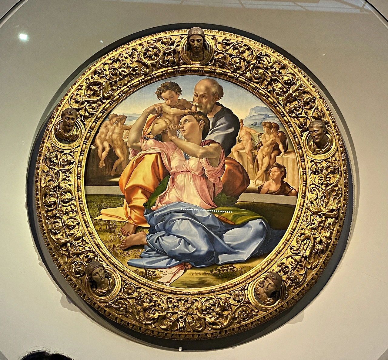 8. 미켈란젤로(Michelangelo Buonarroti)의 톤도 도니(Doni Tondo)이다. 시스티나 성당의 벽화를 제외하고는 미켈란젤로가 유일하게 완성된 귀한 회화작품이다. 안젤로 도니(Angelo Doni)를 위해 그린 작품으로 성모, 아기예수와 성요셉과 뒤 배경에 나체 군상이 있다. ‘톤도’란 이 작품처럼 둥그런 패널 안에 그려진 형태를 말하는데 미켈란젤로 당시 유행한 형식이었다.