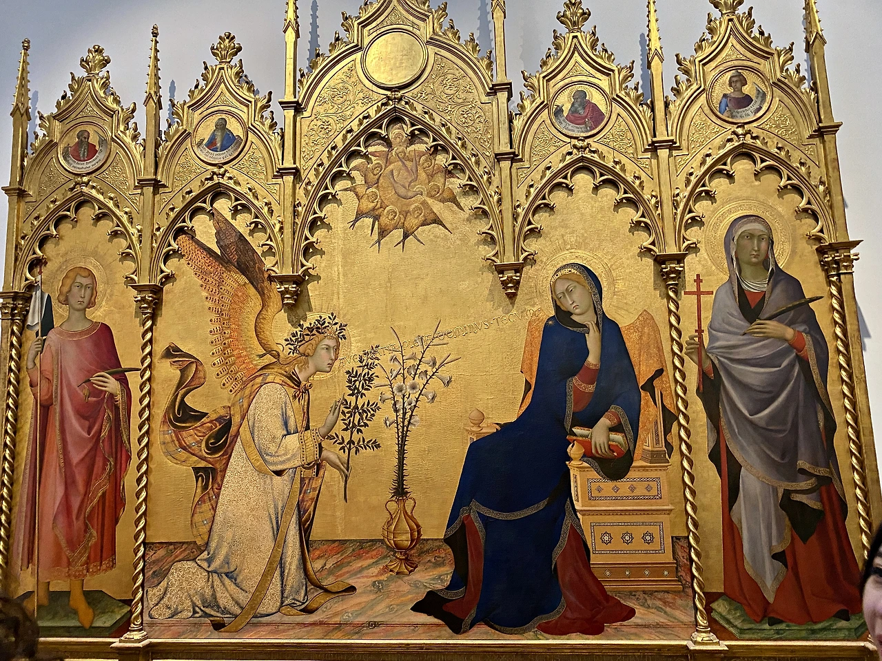 2. 시모네 마르티니(Simone Martini)의 수태고지이다. 시에나 대성당의 산타 탄사노 예배당을 위하여 1333년에 제작되었다.중앙 패널에 성모 마리아와 천사장 가브리엘이 그려져 있다. 백합꽃병은 마리아의 순결을, 올리브 나무 가지는 하나님의 평화로운 전갈을, 두 인물 사이에서 비둘기를 둘러싼 아기천사로 이루어진 장식은 성령의 임재를 암시한다.