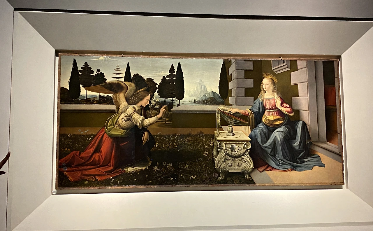 6. 레오나르도 다빈치의 수태고지(Annunciation)이다. 다빈치의 현존하는 가장 오래된 작품으로 안드레아 델 베로키오의 스튜디오에서 견습생으로 있을 때 피렌체에서 완성했다 .대형 포플러 패널에 유화와 템페라를 사용하여 제작되었고 15세기 피렌체에서 인기있던 성경주제, 수태고지를 묘사하고 있다.