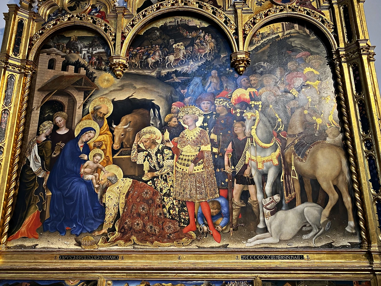 12. 젠틸레 다 파브리아노(Gentile da Fabriano)의 '동방 박사의 경배(The Adoration of the Magi)'는 화려한 제단화이다. 3차원적인 창의적인 구조이며, 모두 연속적인 이미지이다. 유화 물감 쓰기 이전, 실제 금박과 보석이 들어가 있는 템페라 (Tempera) 작품으로 어두운 예배당을 눈부시게 밝혀주는 조명 효과도 있다. 파브리아노는 미술용품 브랜드 이름으로 익숙한데 드디어 그의 작품을 보게 되어 영광이다.