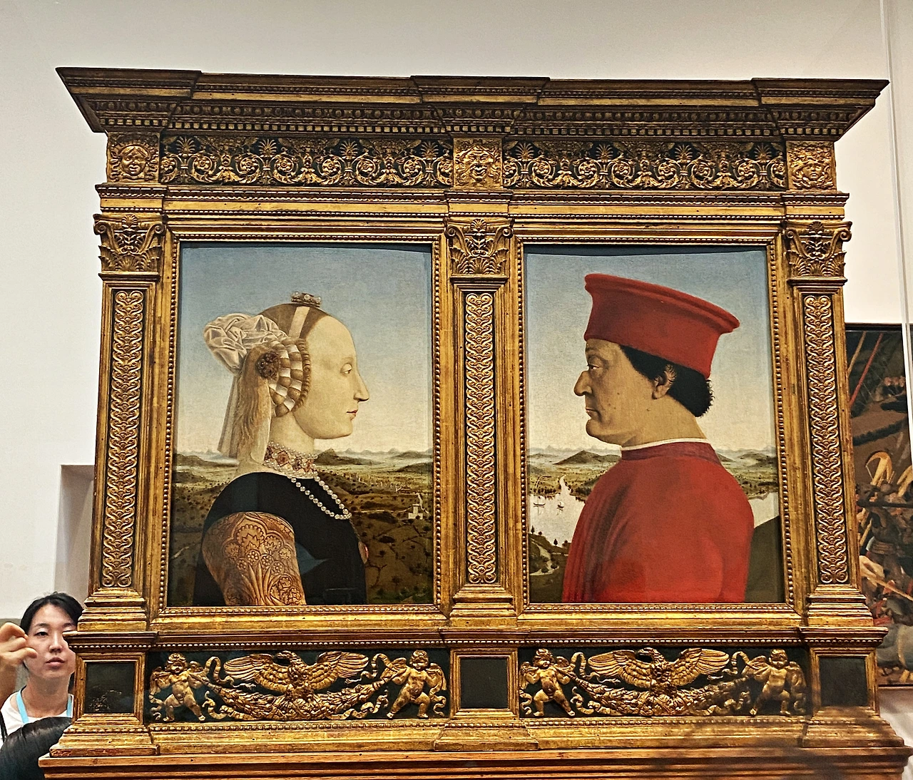13. 피에로 델라 프란체스카(Piero della Francesca)의 페데리코이다 몬테펠트로와 바티스타 스포르차(Federico da Montefeltro and Battista Sforza)의 쌍화이다. 동전 디자인에서 영감을 받은 두 인물은 옆모습으로 묘사되었으며, 이 각도는 좋은 유사성과 감정이 드러나지 않으면서도 얼굴 세부 사항을 충실하게 표현했다. 우르비노 공작 부부 주문으로 제작했다. 페데리코는 마상시합 도중 코가 부러지고 오른쪽 눈을 잃고 오른쪽 얼굴이 완전히 상해버려서 왼쪽모습으로 그려진 것, 코를 보면 돌출되어 있다.