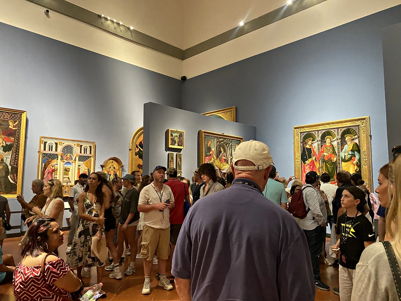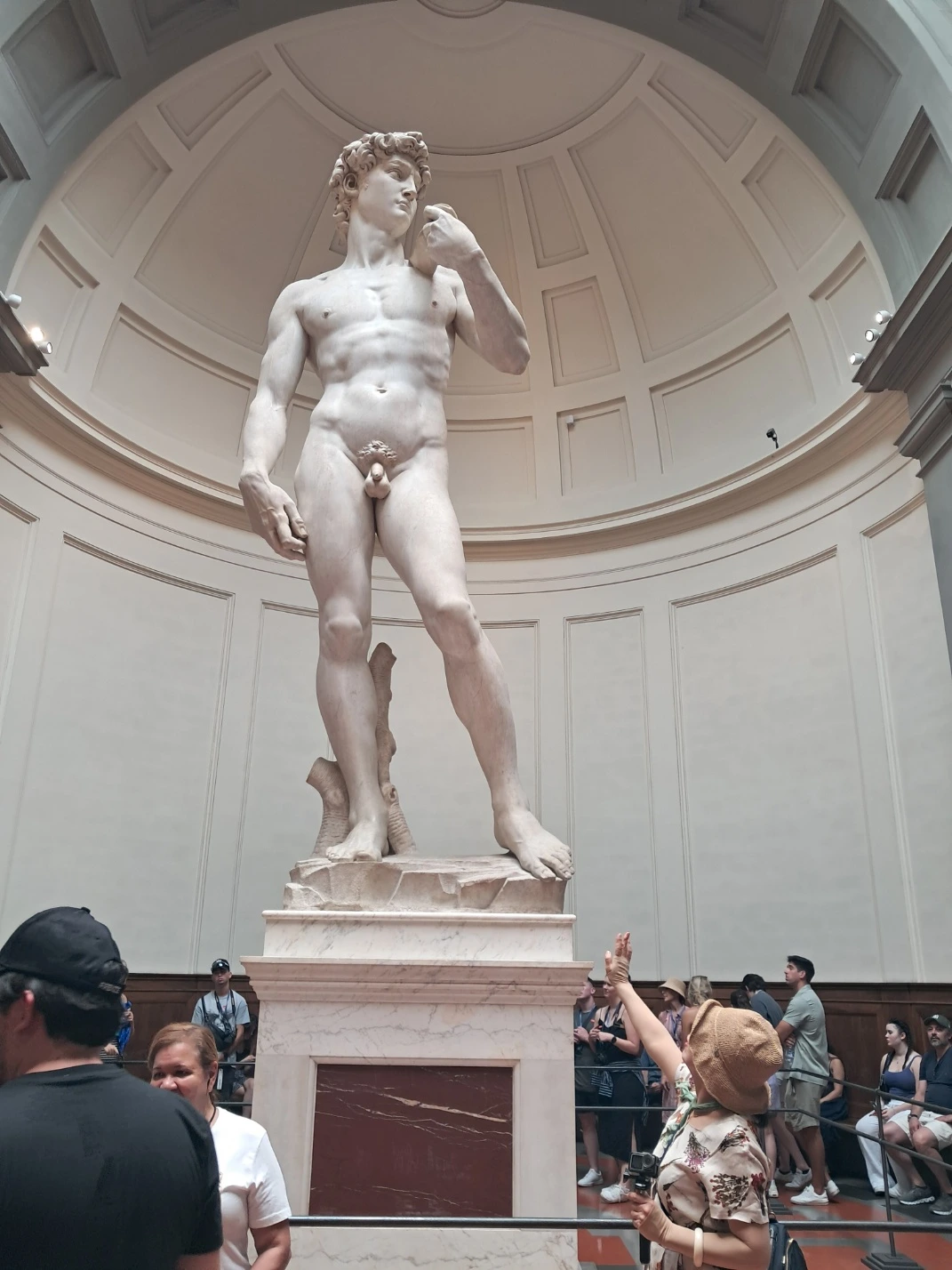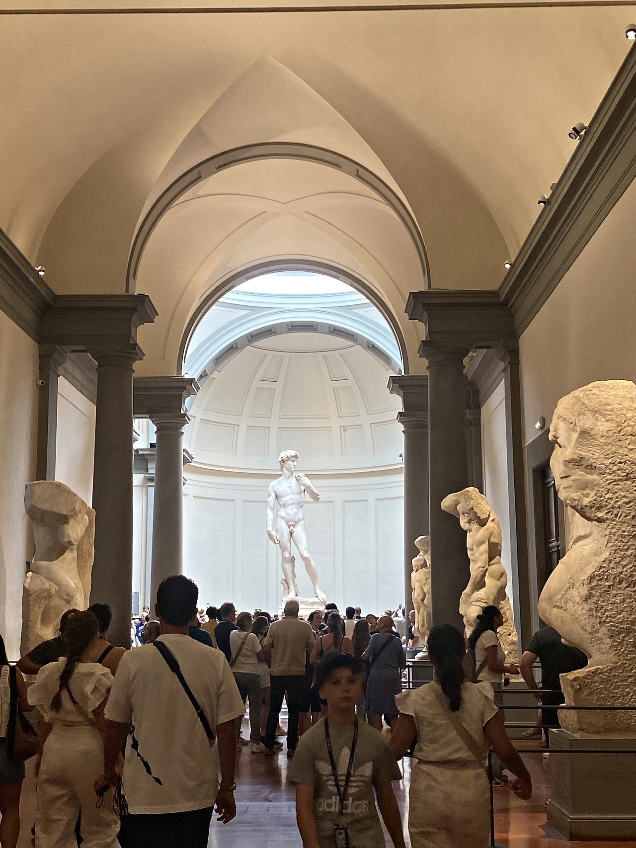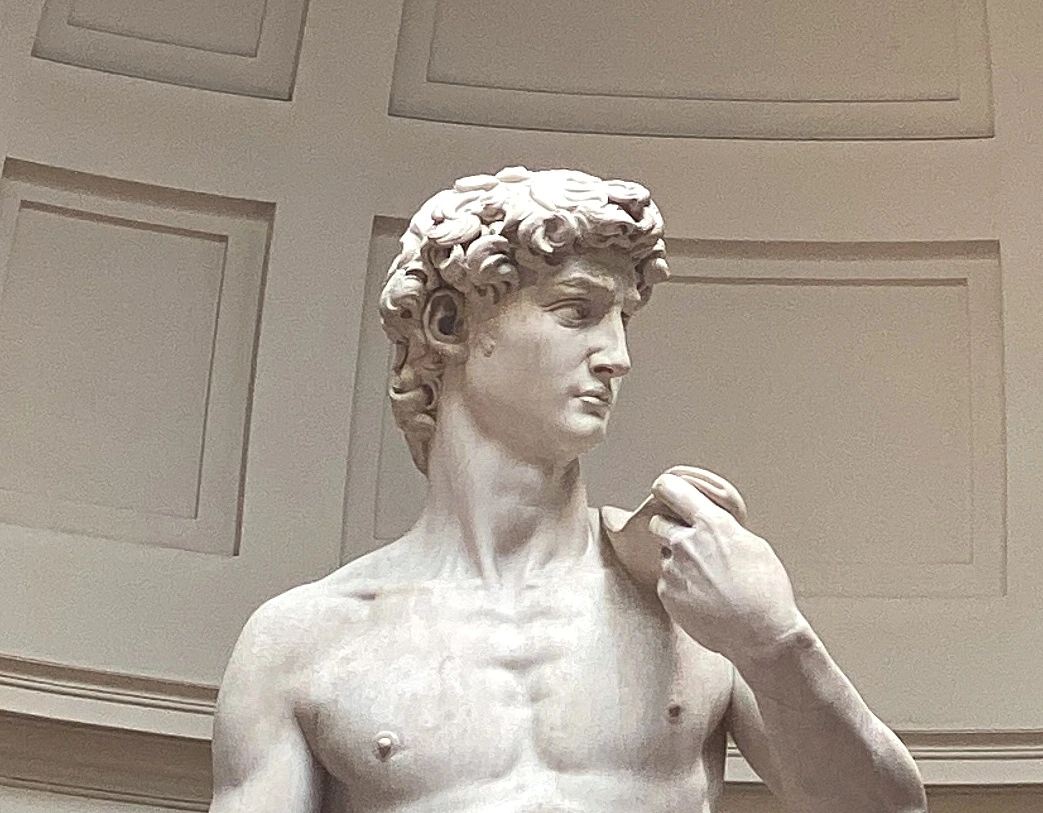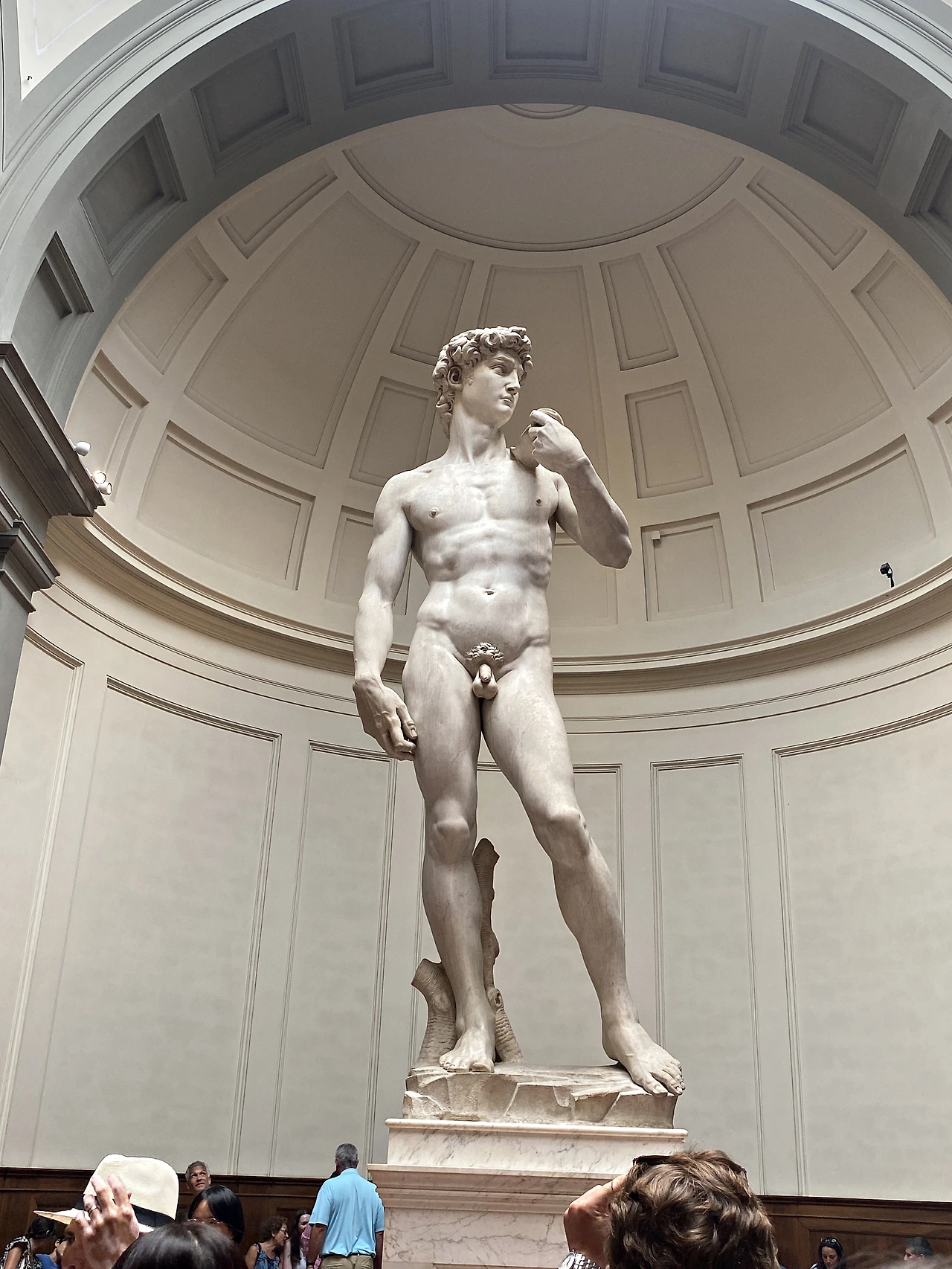 미술관에 들어서면 다비드상은 존재감이 확실하고 강렬한 눈빛은 모든 이를 주눅 들게 한다. 다비드상은 다른 신체에 비해 얼굴과 손이 매우 크다. 조각상을 밑에서 바라보는 점을 고려했다고 한다. 매끈하고 탄탄해 보이는 근육질의 몸은 세계의 조각상 중 가장 으뜸일 것이다. 다비드상은 애국과 호국의 상징으로 르네상스를 넘어 고금을 통해 최고의 조각품이라는 찬사를 받고 있다.