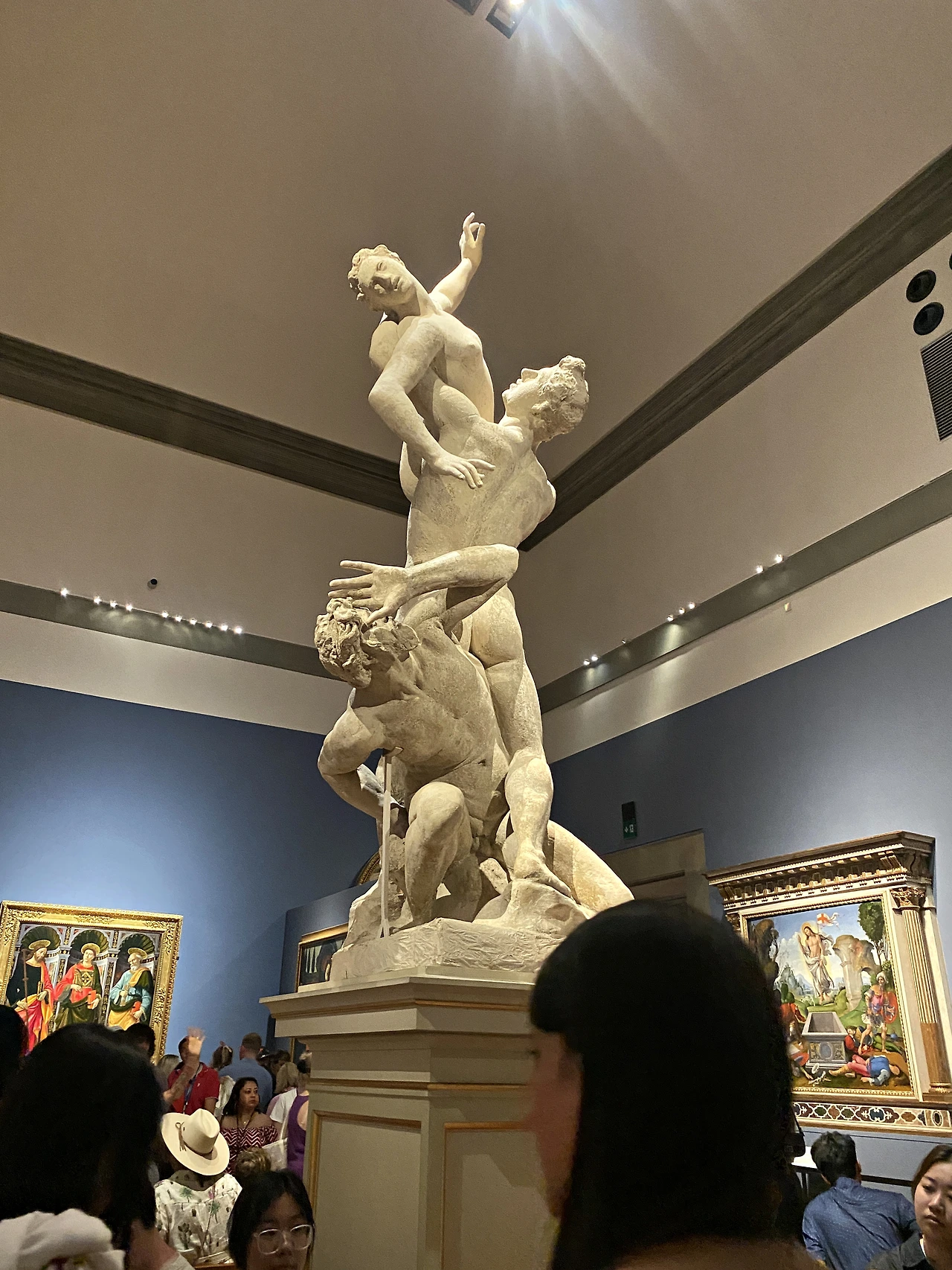 잠볼로냐(Giambologna, 16세기 이탈리아-플라망 조각가)의 '사비니 여인들의 납치'는 단일 대리석 블록으로 3명의 인물(조각된 여자를 공중으로 들어 올리고, 웅크리고 있는 두 남자)을 조각했다. 사비니 여인들의 납치(라틴어: Sabīnae raptae)는 로마 신화의 한 사건으로, 로마의 남성들은 이 지역의 다른 도시에서 젊은 여성을 대량으로 납치했다. 가족과 문화의 연속성을 위한 결혼의 중요성을 상징하는 것으로 르네상스 시대에 화가와 조각가에게 인기 있는 주제였다. 또한, 성적인 주제의 이점을 더하여 극단적인 포즈로 여성과 남성 인물을 묘사하는 작품도 있다. 같은 주제로 많은 작품이 있지만 자크 루이 다비드 사비니 여인들의 개입(1799, 루브르 박물관)이 익숙하다.