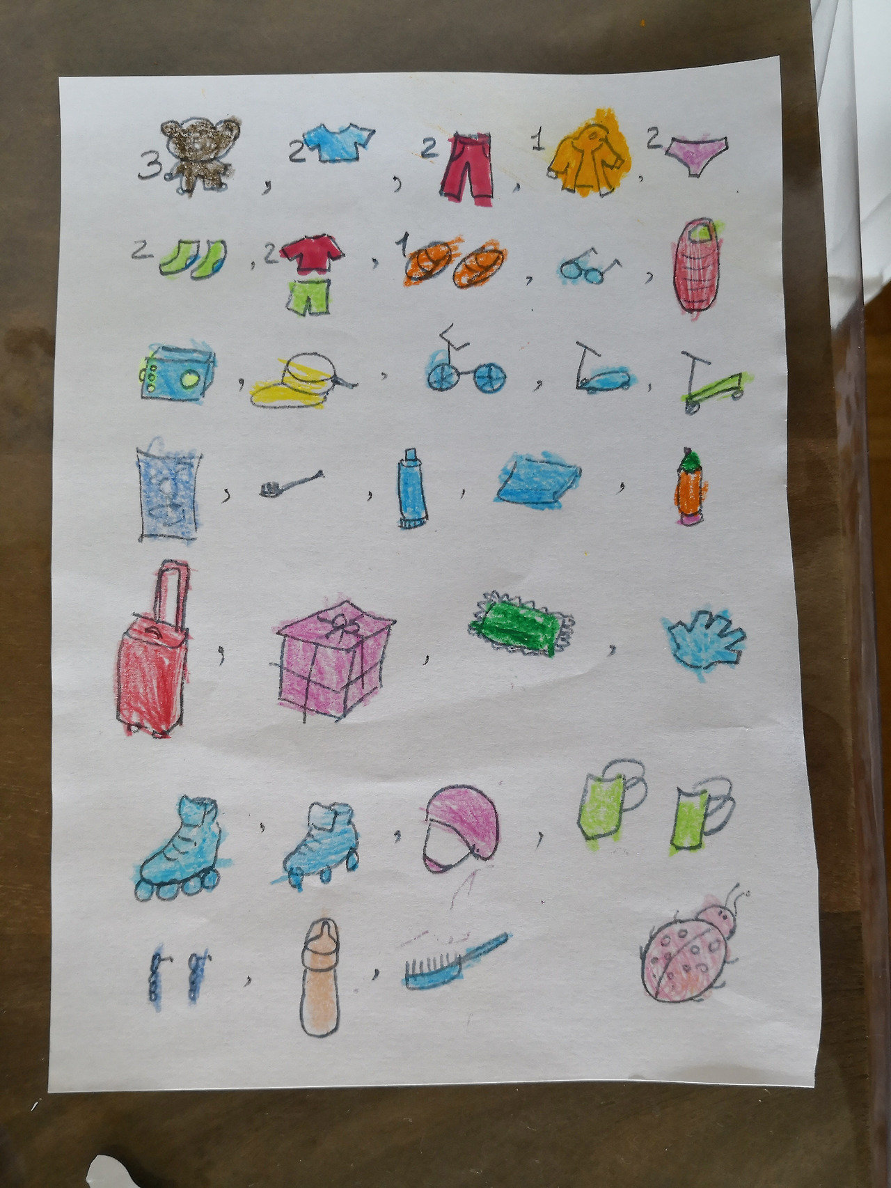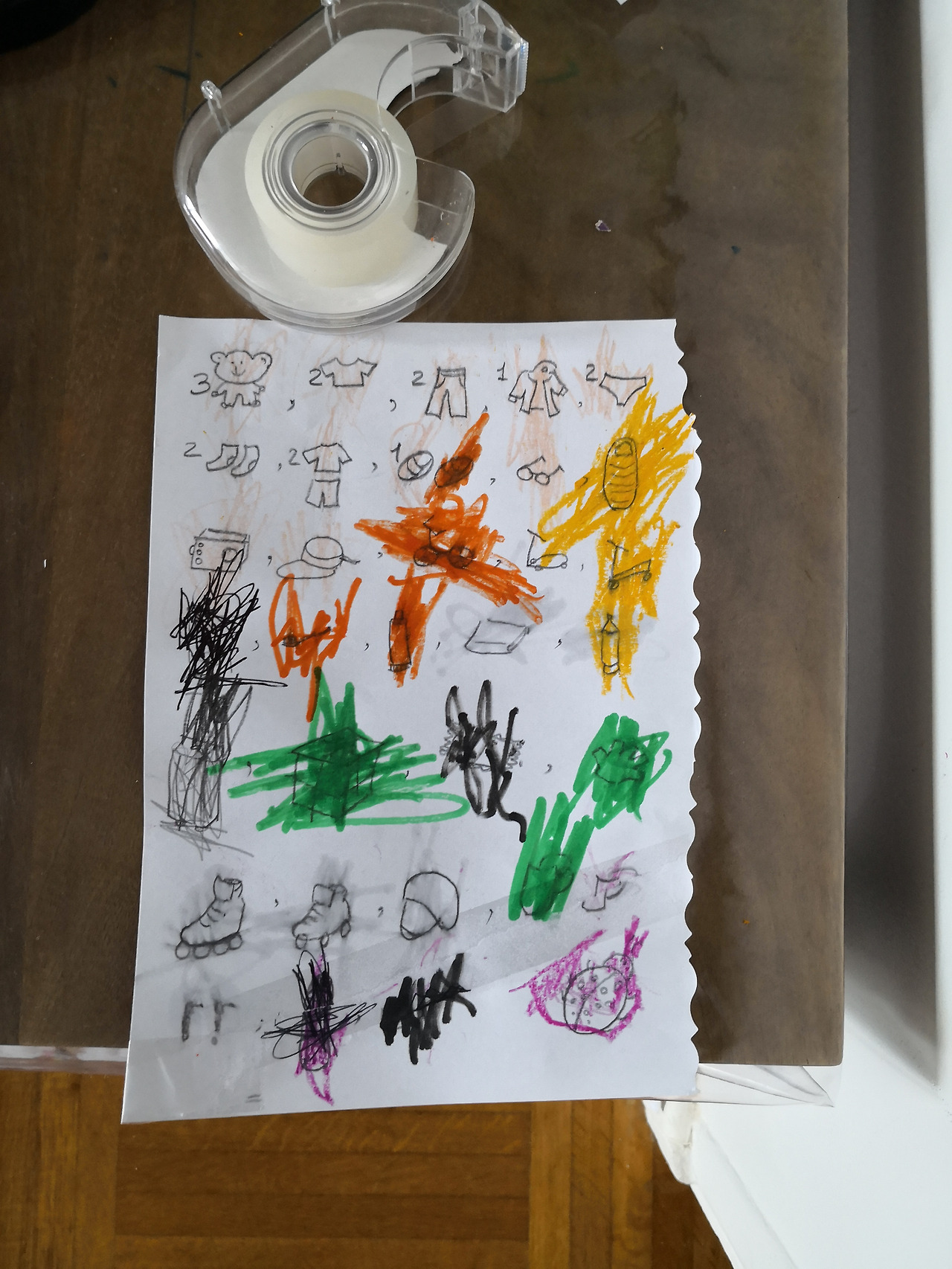 종이 리스트에 그려진 텅 빈 그림에 아이들은 알록달록 색칠을 했다. 아이들은 가방을 다 싸고도 그림 종이를 들고 다녔다. 다음날 아침 짐가방을 차에 실으면서도 가방에 넣지 못한 자전거와 킥보드 같이 커다란 물건들을 종이를 보며 챙겼다. 종이는 항상 아이들을 따라다녔고, 휴게소에서도 두는 종이를 들고 내리고 싶어 했다. 할머니 댁에 도착해서 처음으로 한 일도 리스트를 할머니께 보여주는 것이었다. 종이 리스트가 아이들이게 이렇게까지 의미 있는 물건이 될지 나는 예상치 못했었다.