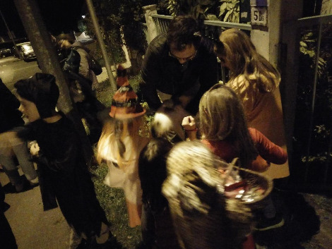 아이들이 외치는 소리에 어김없이 사탕 비가 뿌려진다. 할로윈이라고 집 대문 쪽에 호박을 놓아두었거나 할로윈 장식을 해 놓은 집의 벨을 누르면 기다렸다는 듯이 집주인이 나와서 수많은 아이들에게 사탕과 군걸 질을 한 주먹씩 나눠 준다. 골목골목을 배회하던 중 마주친 유아학교 교장 선생님 댁에서도 아이들은 사탕을 푸짐하게 받아 나왔다.
