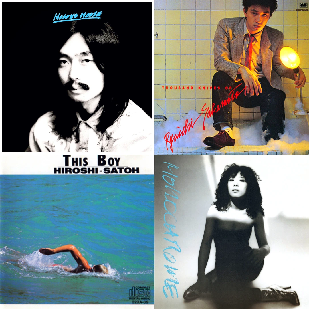 시계방향으로 호소노 하루오미의 <Hosono House>. 보사노바 풍의 포크록 앨범이다. 다음은 사카모토 류이치의 <Thousand Knives>로 아방가르드한 성향이 강한 전자음악을 다루고 있다. 요시다 미나코의 <Monochrome>은 소울/훵크에 가깝다고 생각되지만 시티팝이라고도 할 수 있겠다. 마지막으로 사토 히로시의 <This Boy>는 미니멀한 테크노/하우스 앨범이다.