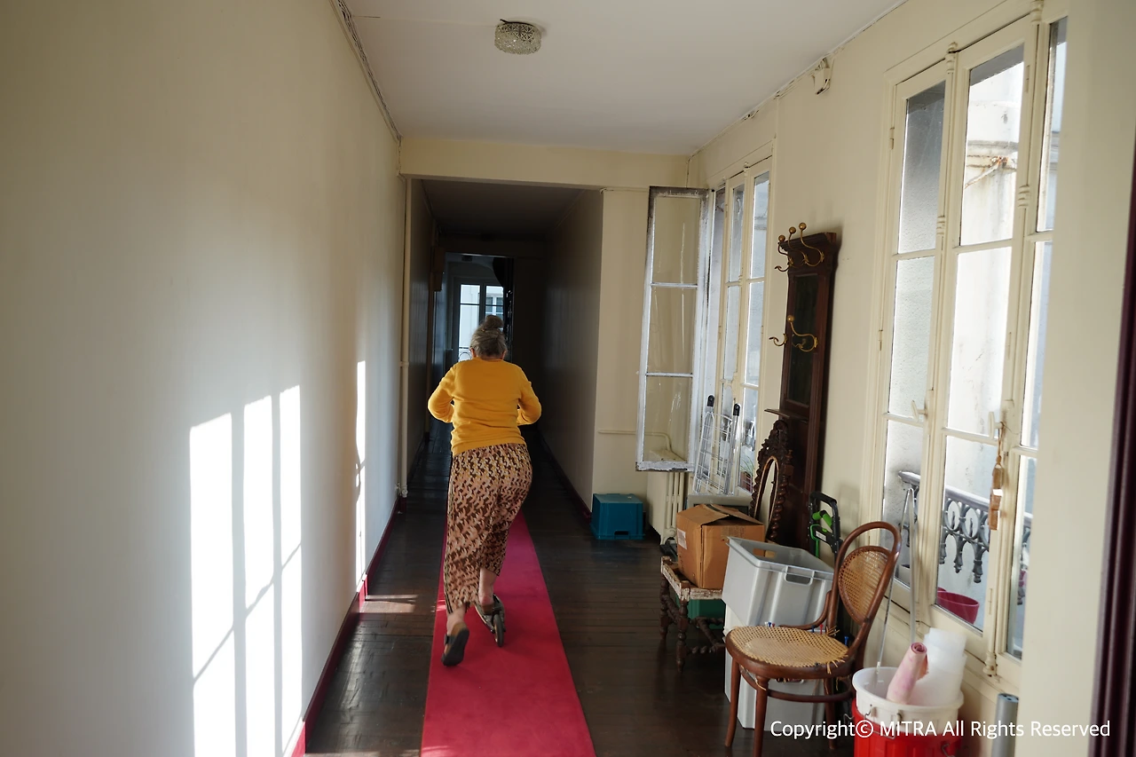 복도에서 힘껏 킥보드 바퀴를 굴리는, 이 귀엽고 유쾌한 70대 할머니를!