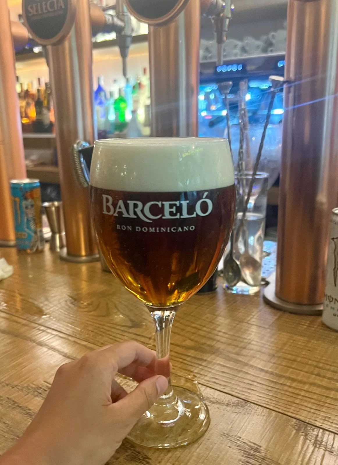 그곳에 멈춰 아주 시원한 맥주 한 잔을 사들고, 앞에 있는 간이 테이블에 앉았다.