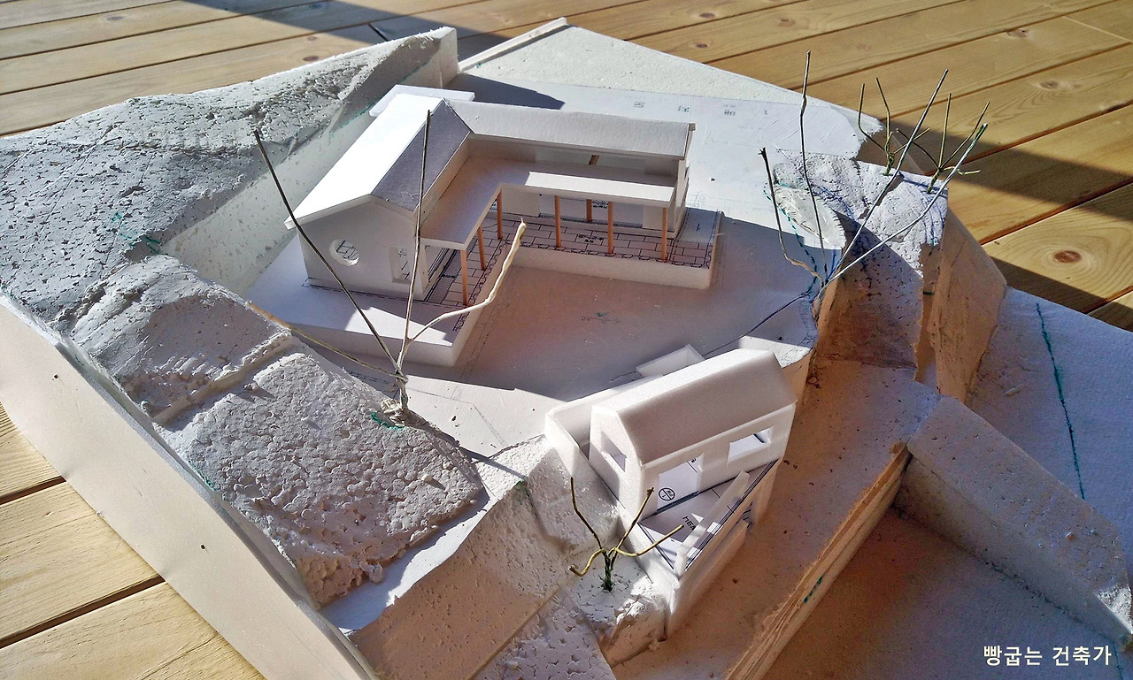 경사진 땅의 쓰임을 건축가들이 잘 알고 있으니 축대로 인해 사라진 장소의 관계성을 가평 별장에서 다시 살려내려고 몇 가지 건축적 장치를 해두었습니다. 주말 아침에 모형을 만드는 동안 현장소장은 느릅나무와 산뽕나무의 위치를 중심으로 높이 산정을 하고 있습니다. 이제 모형이 만들어지고 있을 뿐인데 열기가 오른 김 소장은 땅 정리를 마치고 마당과 깊은 처마의 높이를 다시 계산하고 있습니다. 건축가들에게는 모형을 만드는 일이 어떤 놀이보다도 재미난 일이라고 이야기하고 싶어 지는군요. 당신의 집은 어떤 땅 위에 지어졌을까요?