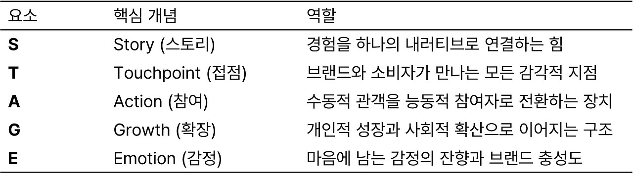 이후 포스팅에서는 STAGE 모델의 다섯 축—Story, Touchpoint, Action, Growth, Emotion—을 순차적으로 깊이 있게 풀어보겠습니다. 각 축은 브랜드 경험 설계자가 반드시 고려해야 할 전략적 키워드이자, 실무에서 반복 가능한 실행 원리입니다.
