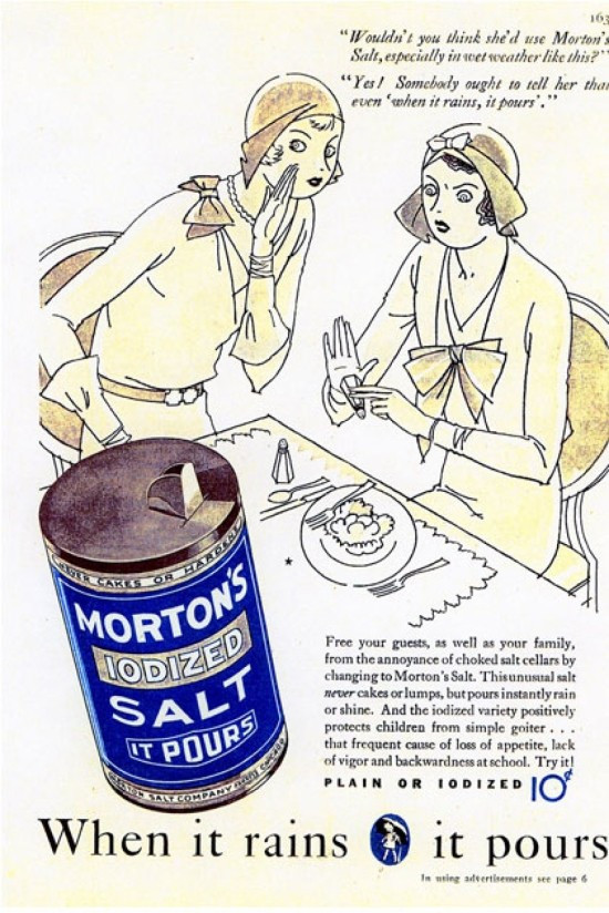 MORTON사의 소금 패키지엔 유명한 두 가지가 있다. 하나는 비오는 날 우산을 든 어린 소녀 로고이다. 이 소녀가 든 소금통은 소금이 줄줄 흘러서, 처음 보는 사람은 무슨 일인지 관심을 갖게 만들 정도이다. 또 다른 하나는 소금 소녀(Salt Girl) 주위에 있는 'When it rains, it pours.' 광고문구이다. '나쁜 일은 한꺼번에 쏟아진다' 혹은 '설상가상'이라는 의미이다.
