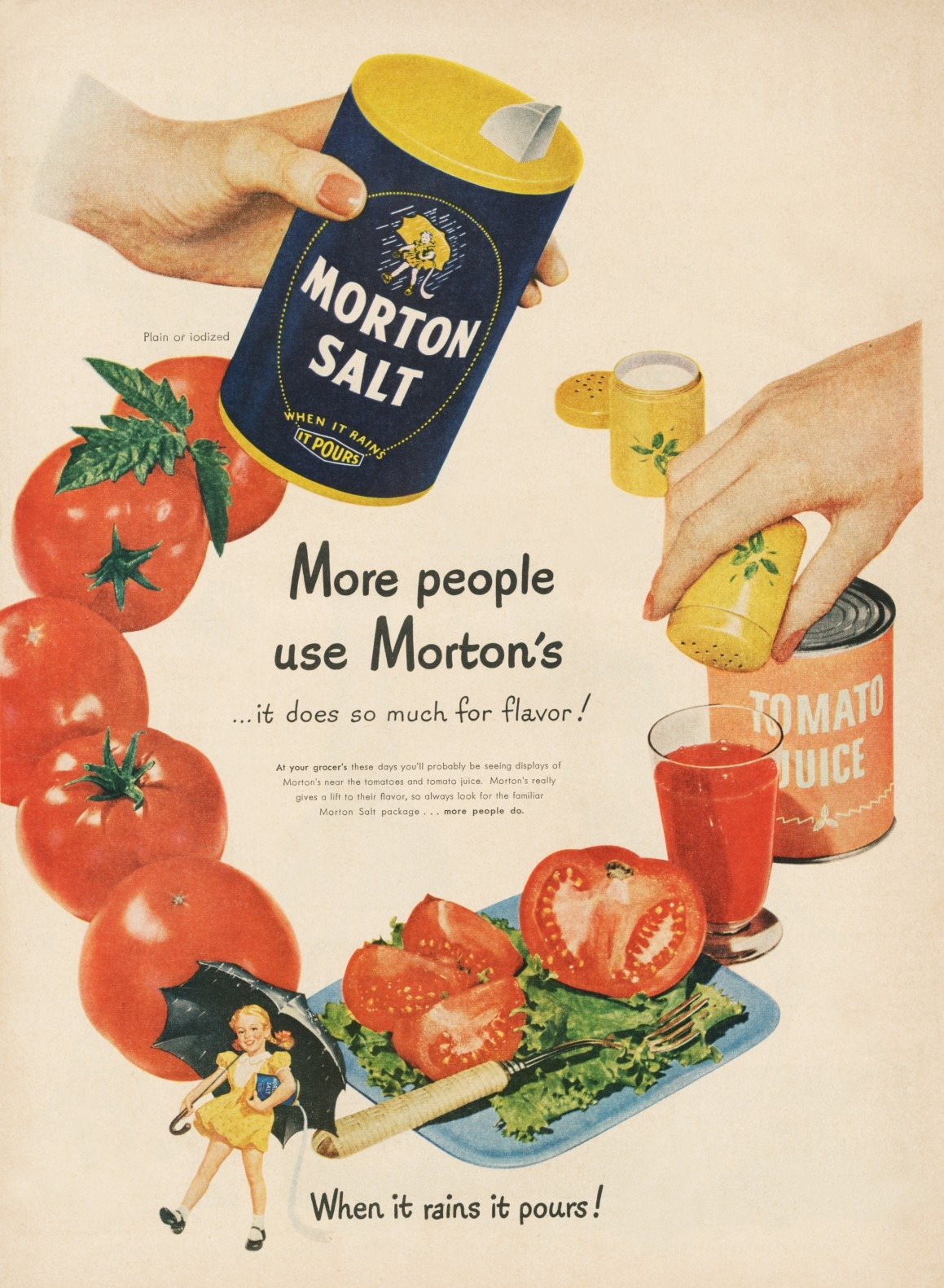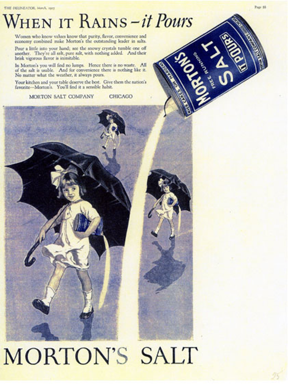 이런 광고 문구가 등장한 데는 다음 과 같은 상황이 있었다. 20세기 초엔 미국 식탁 위에 놓여있는 식용소금(table salt)의 입자가 조잡했기 때문에 비가와서 습도가 높은 날이면 덩어리로 뭉쳐서, 소금을 흔들어도 소금이 제대로 나오지 않았다고 한다. 모튼 사는 이 문제를 해결하기 위새 약간의 탄산마그네슘을 첨가해 소금의 뭉침을 방지하는 획기적인 기술을 발견했다. 모튼 사는 자사의 이런 개발을 소비자에게 크게 홍보하고 싶어했다. 그래서 비가 내릴 때도 모튼Morton 소금은 뭉치지 않고 펑펑 잘 쏟아진다는 의미를 전달하기 위해, 비오는 날 줄줄 새는 소금통을 든 소녀의 이미지와 'When it rains, it pours.'라는 광고 카피를 썼다. 이는 전미국인이 머릿속에 각인되었고, 미국 생활 문화의 한 부분이 되어 있다. 모튼 소금 소녀의 이미지는 시대에 따라 변화해 왔는데, 현대로 내려올수록 소녀의 표정이 무심한 얼굴로 변해왔다는 평이다.