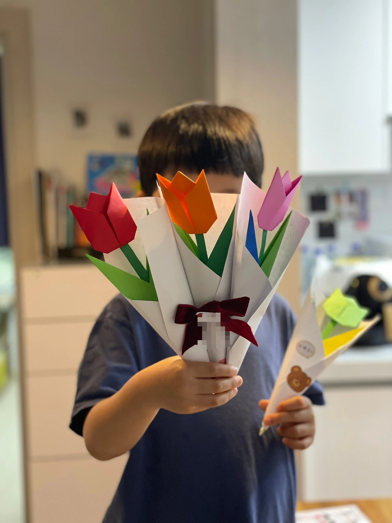 유튜브에 튤립 접는 법을 검색해 열심히 따라 접었다. 색종이 색깔도 직접 고르고 어떤 위치에 어떻게 포장할 것인지도 아주 고심하여 선택한다. 그림을 그리거나 종이접기를 할 때마다 엄청난 집중력을 가지는 모습이 예술의 혼을 일으키는 것 같다. 그 모습이 참 귀엽다. 고사리 같은 손으로 꼼지락꼼지락.