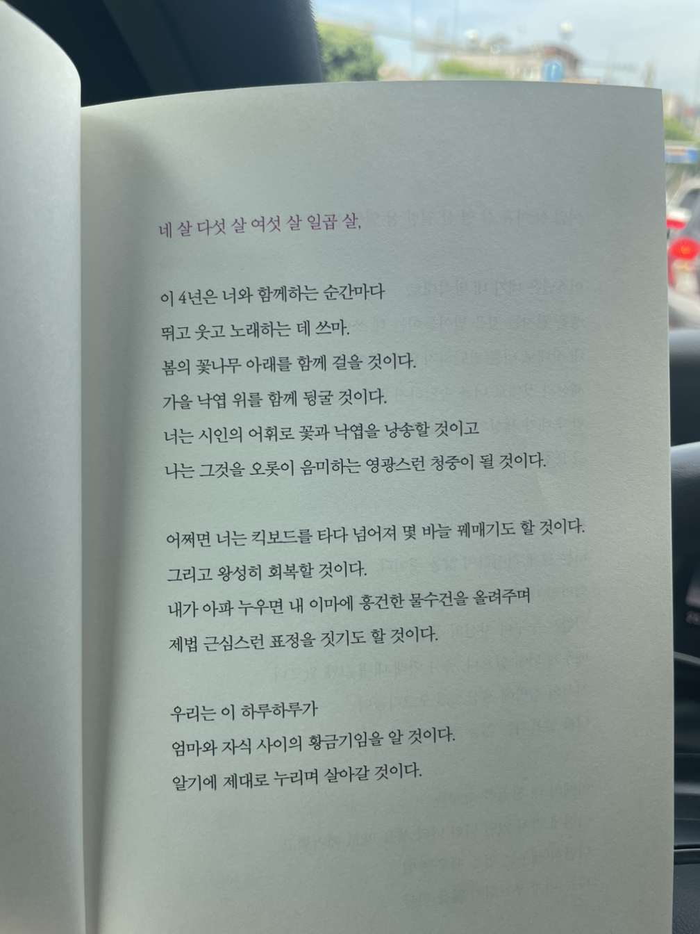 "마침내, 꽃이 피는 것을 보았습니다. 세상에 그렇게 보람찬 일이 없었죠. 하루하루 투실투실 해지는 아기의 허벅지 하며! 하루하루 넙데데해지는 얼굴 하며! 온몸의 마디마디가 쑤시고 아팠는데도, 아기 살냄새만 맡으면 벌떡 일어나졌어요. "(p.50)