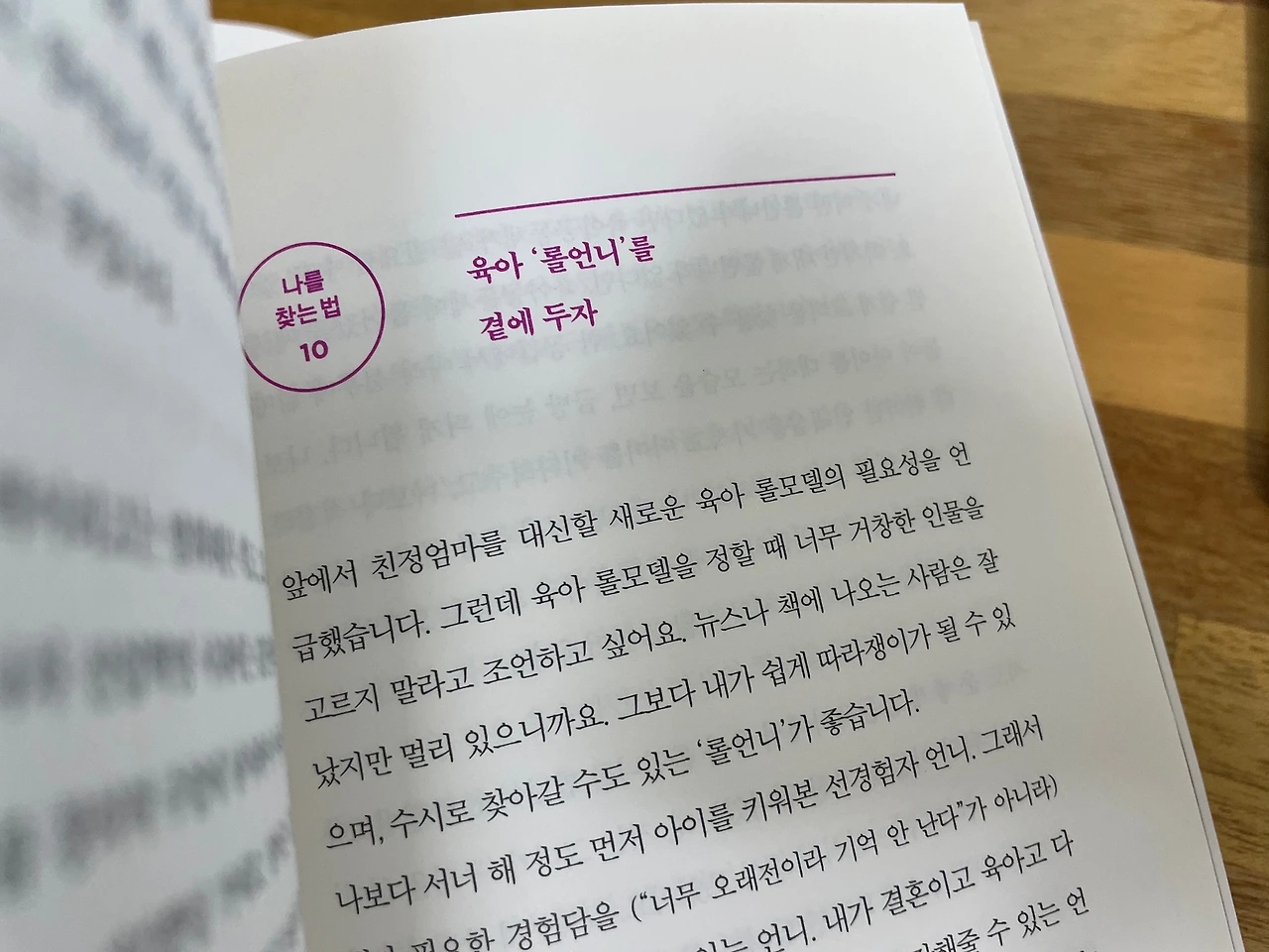 "육아 롤 모델을 정할 때 너무 거창한 인물을 고르지 말라고 조언하고 싶어요. 뉴스나 책에 나오는 사람은 잘났지만 멀리 있으니까요. 그보다 내가 쉽게 따라쟁이가 될 수 있으며, 수시로 찾아갈 수도 있는 '롤 언니'가 좋습니다. "(p.219)