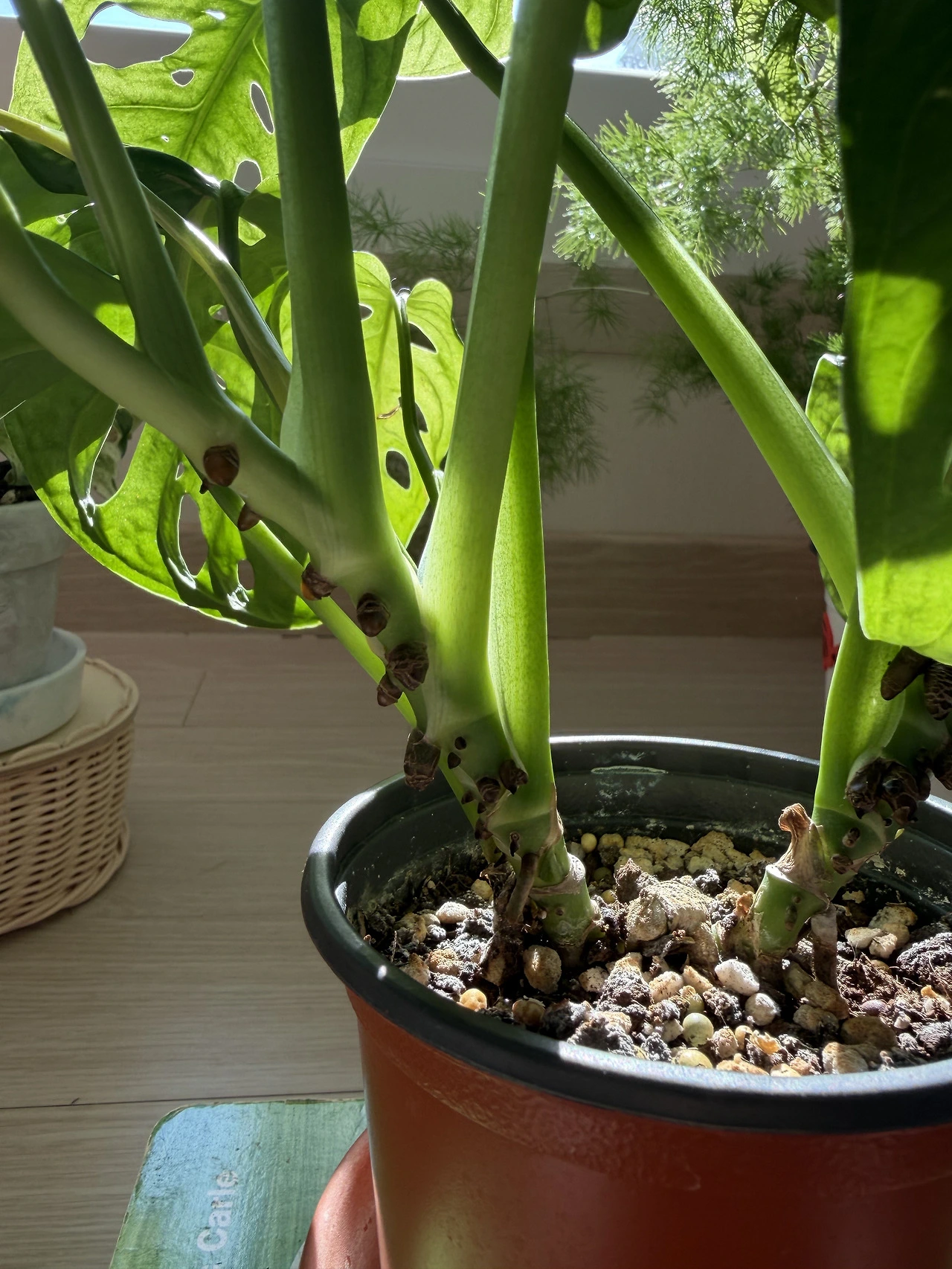 몬스테라 아단소니의 줄기에 무언가가 붙어있었다. 이 추운 겨울에 벌레들이 붙어 있을 리는 없었다. 아무래도 새싹이 돋으려는 것 같았다.