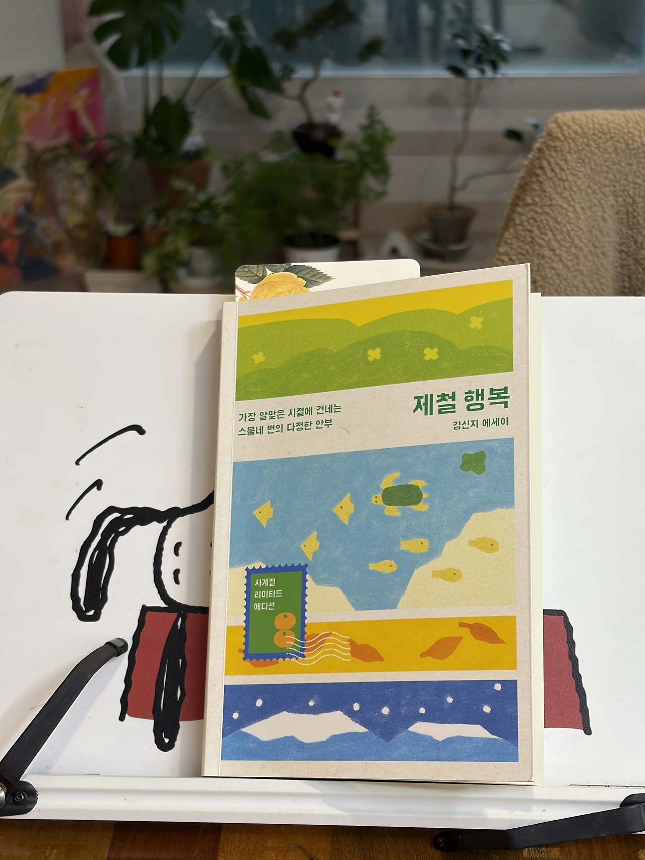 이런 생각을 하던 도중 시기적절하게 이 질문에 해답을 줄 수 있는 책이 나에게 찾아왔다. 김신지 작가의 에세이 <제철 행복>이다. 지난 1월, 도자기 전시 때 선물 받은 책인데 ‘지금 나에겐 계절의 행복을 느낄 만큼의 한가함이 없네.’ 하며 읽기를 미뤘던 책이었다.