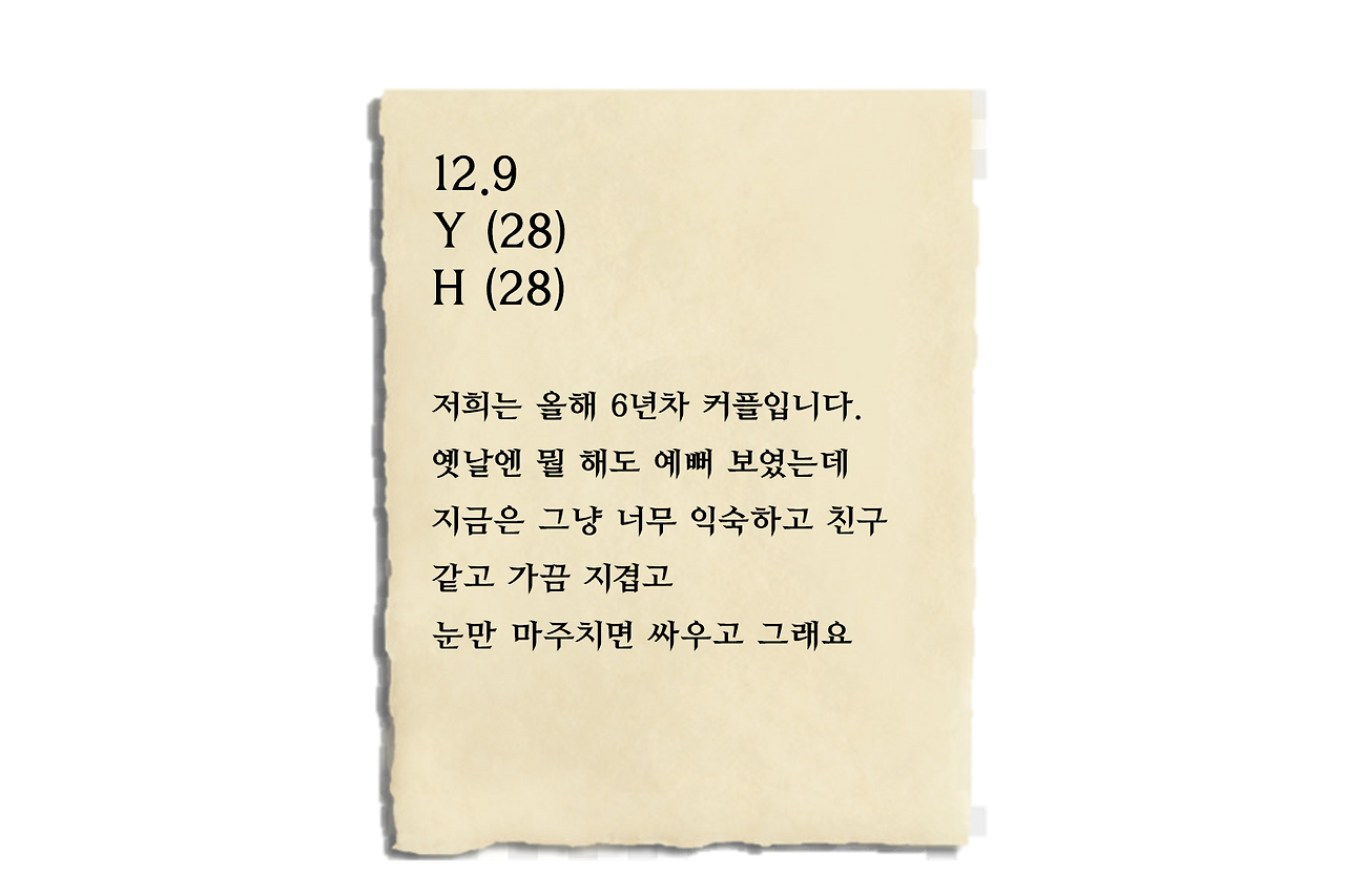 H: 맨날 이런 식으로 싸워요. 감정 상할 때도 많고. 대학 동기 애들은 진짜 너네 아직도 사귀냐고 언제 헤어질 거냐고 신기하다고 맨날 그래요.