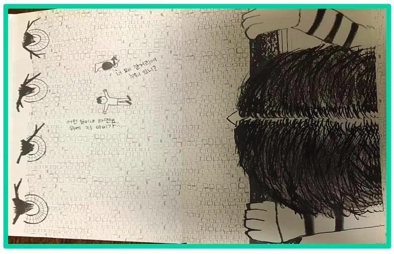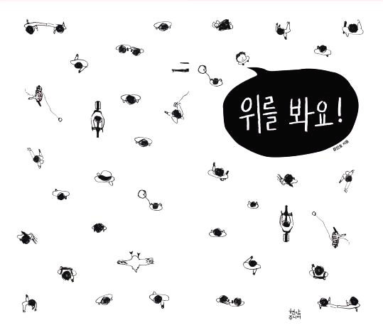다음 장을 넘기는 순간, 뭉클한 감동이 몰려옵니다. 길에 서 있던 아이는 수지를 위해 길바닥에 발라당 누워 버려요. 장바구니를 매고 지나가는 어른도 함께 나란히 드러눕고, 그러다가 하나둘 모두 누워버리죠. "모두 위를 봐요!"라고 외치자 수지는 웃는 얼굴로 고개를 듭니다. 이 장면이 오랫동안 가슴에 머물렀어요. 바라보는 시선의 변화로 빚어낸 뭉클한 감동. 비극이 희극으로 바뀌는 관점의 변화! 그 한 끗 차이가 느껴지셨나요? 한 아이의 작은 관심과 사람들의 따뜻한 마음이 더해져 수지는 새로운 희망을 품게 되었답니다.