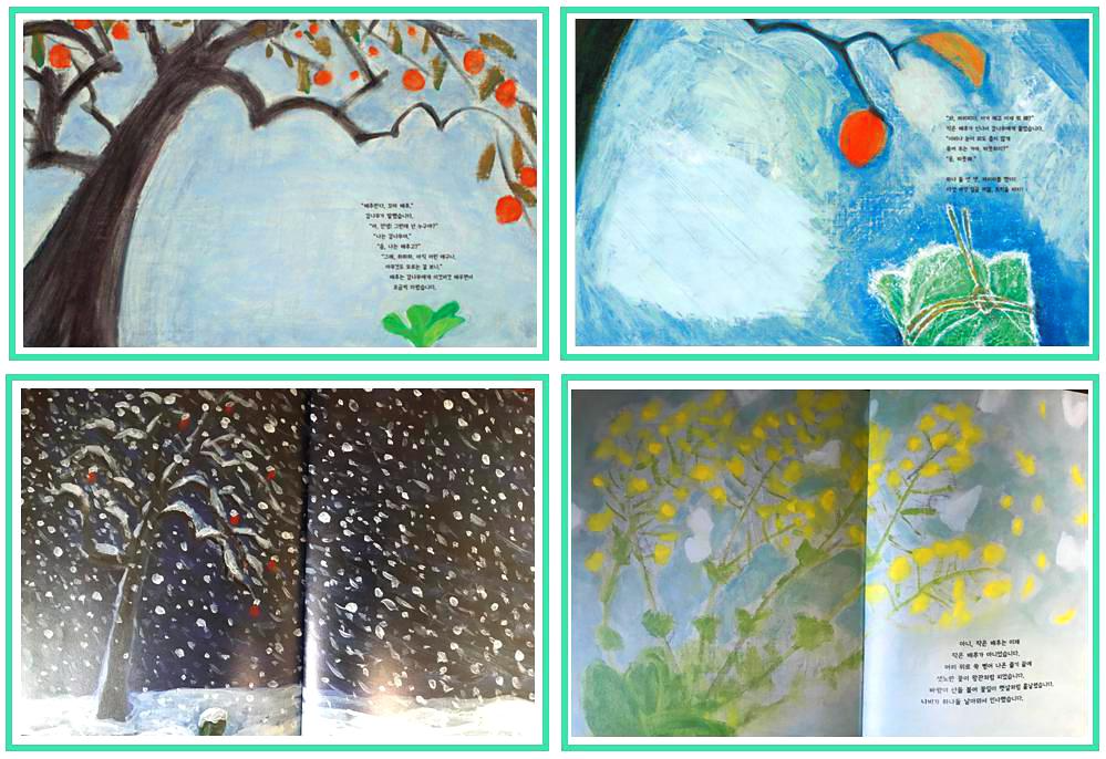 펑펑 함박눈 내리는 깊은 겨울밤, 감나무 곁에 꼿꼿이 버티고 있는 작은 배추를 그린 장면을 보며, 좌절하지 않고 시련을 극복해내는 단단한 배추 한 포기의 힘을 느낄 수 있었습니다. 이 장면에서 글은 단 한 줄도 없었지만, 배추의 결연한 의지가 온몸으로 전해졌습니다. 봄은 약속을 지키듯 어김없이 찾아왔고, 채소 트럭은 다시 찾아오지 않았지만, 그보다 더 아름다운 나비와 햇살이 다가왔습니다. 겨울을 잘 이겨낸 배추는 노랗고 화사한 꽃을 활짝 피웠습니다. 그 어떤 배추도 갖지 못했던 샛노란 왕관을 쓴 채 감나무에게 성숙한 모습으로 인사했어요. 겨울의 시련을 견딘 작은 배추는 이제 더 이상 작은 배추가 아니었답니다.