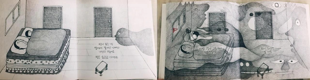 방이 없는 소년은 방에서 쫓겨난 아빠와 나란히 누웠다. 밤은 슬금슬금 다가오고, 까만 것들이 가득 차서 밤을 만든다. 밤이 무서우면 새를 그린다. 새를 그려도 밤은 사라지지 않고, 밤은 죽음과 닮았다. 죽음은 어쩔 수 없는 것이라고 말한다. 그러면서 할머니를 떠올린다.