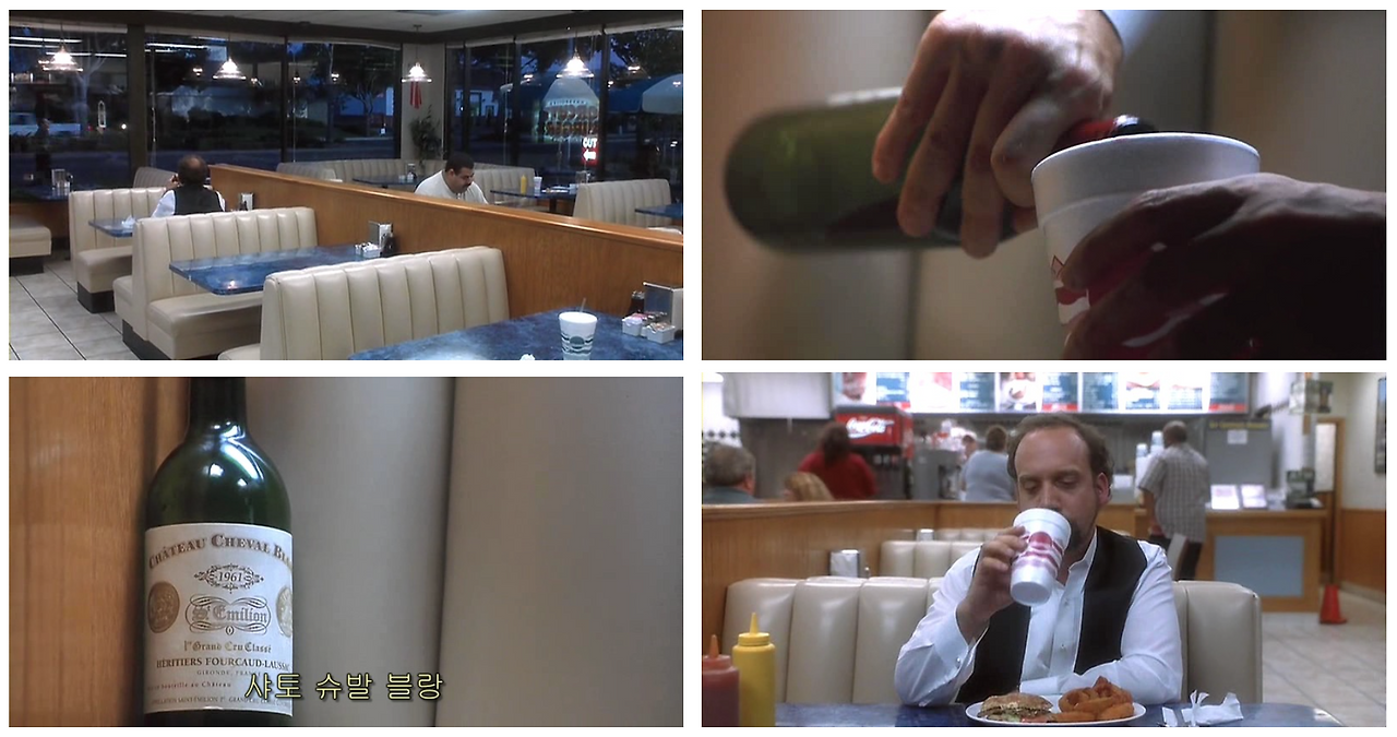 결국 영화의 막바지 오랜만에 본 전처의 재혼과 임신 소식에 마일즈는 그 길로 와인을 집어 들고 아무 카페테리아에 들어간다. 61년 산 샤토 셰발 블랑을 부어 마신다. 와인글라스가 아닌 탄산음료 종이컵에, 고급 치즈 대신 패스트 푸드를 곁들여서.