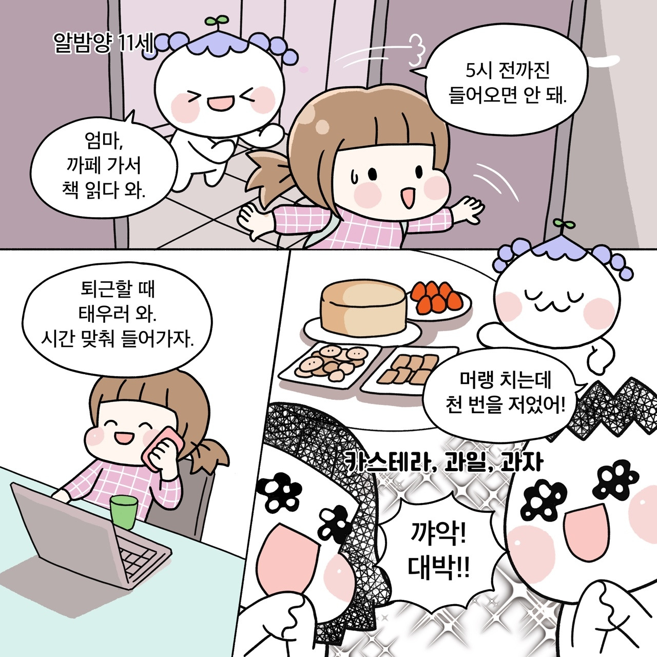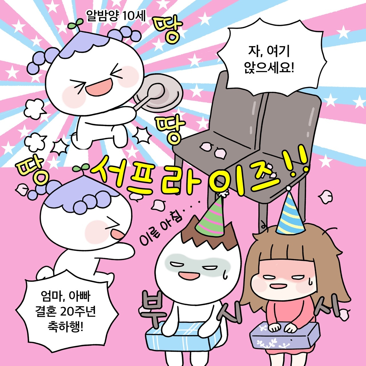 결혼기념일에 종이로 가랜드를 만들어 벽에 붙이고 미리 선물을 준비해 이벤트를 해 주기도 하고 한참 제빵에 빠져있을 때는 케이크를 만든다고 주방을 무법천지로 만들기도 했다. 재료비가 케이크를 사는 거보다 더 들고 쓰나미가 휩쓸고 간 미끌거리는 주방을 치우는 데 힘을 빼야 할 걸 생각하면 그냥 케이크 하나 사자고 말하고 싶었지만 아이의 반짝이는 눈빛을 보니 차마 말할 수 없었다. 그렇게 알밤이는 매년 엄마, 아빠 생일과 기념일을 챙기면서 무럭무럭 자라 예비중딩 열네 살 언니가 되었다. 키는 고무줄로 늘인 듯 쑥 커졌고 발랄한 에너지는 차분해졌으며 가볍던 몸은 묵직해졌다. 그래도 변하지 않는 건 알밤양의 서프라이즈다.