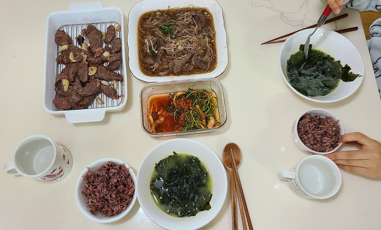 알밤이는 핸드폰으로 레시피를 보면서 미역국을 끓이고 시판용 불고기를 꺼내 볶고 구이용 소고기를 양념을 한다고 분주했다. 나는 일부러 한 번도 일어나지 않고 거실에서 일을 했다.