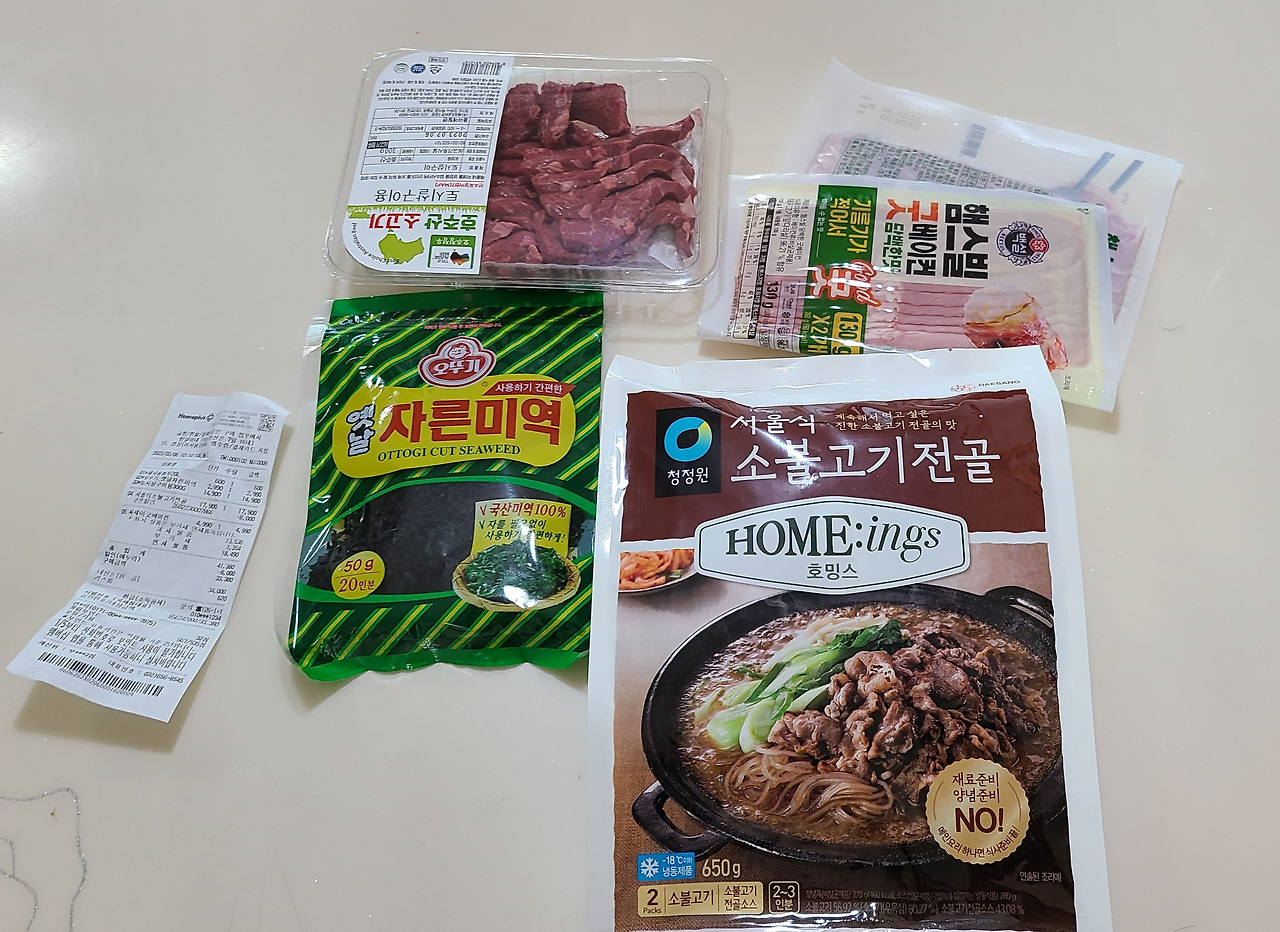 올해는 모종의 움직임이 포착되지 않길래 그냥 넘어가나 싶었는데 생일 당일 아침에 주섬주섬 옷을 챙겨 입고 밖에 나가더니 한참 있다 한 보따리를 들고 돌아왔다. 집 앞 슈퍼보다 조금 더 멀리 있는 홈플러스 익스프레스에 가서 장을 봐 왔단다.