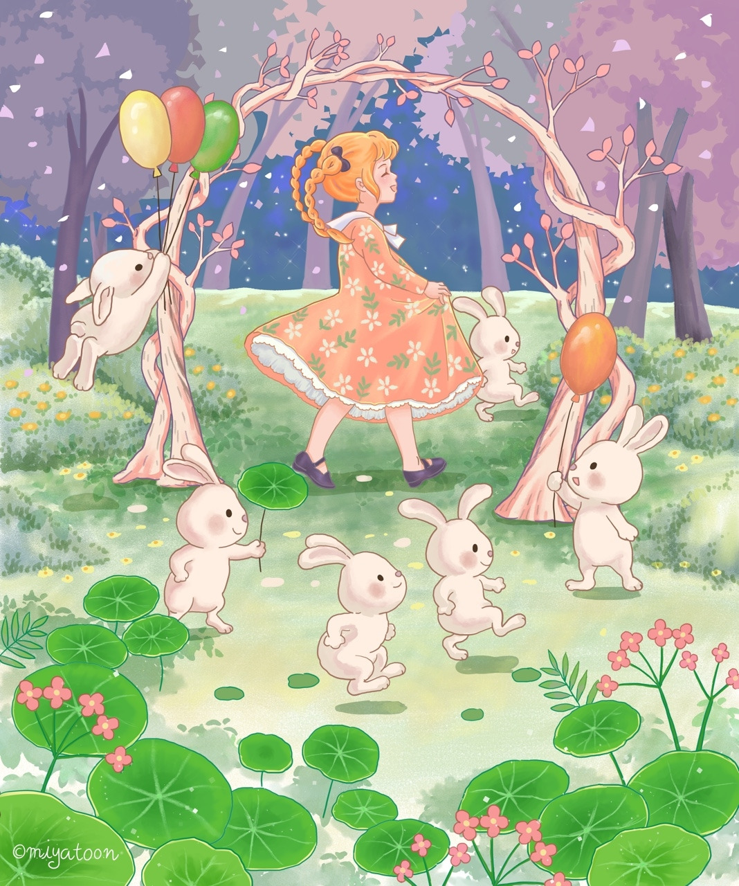 초록빛이 날로 짙어져 가는 한여름이에요. 바람은 나뭇잎을 살랑살랑 흔들고 나뭇잎은 반짝반짝 빛가루를 쏟아내요. 빛가루는 바람을 타고 우아하게 춤을 추어요. 시원한 바람이 소녀의 이마에 맺힌 땀을 식혀줘요. 나무에 가려져 있지만 하늘에는 둥근 보름달이 떠 숲 속을 환하게 밝혀줘요. 소녀가 밤마실을 나왔어요. 숲 속 학교에서 수업을 하던 토슬반 친구들이 소녀를 발견했어요. 콧노래를 흥얼대며 소녀가 걸어가요. 토끼 한 마리가 몰래 교실을 빠져나와 소녀를 뒤따르기 시작했어요. 소녀는 갖고 있던 풍선을 선물로 주었어요. 소녀와 토끼가 신나게 놀다 보니 어느새 토끼 친구들이 모여들었어요. 하나 둘, 하나 둘, 소녀와 토끼들이 행진을 하다 아지트를 찾았어요. 둥근 아치형 문으로 들어가요. 똑똑, 잠시 실례합니다. 소녀는 무척 예의가 바르기 때문에 성에 사는 주인에게 인사를 잊지 않아요.