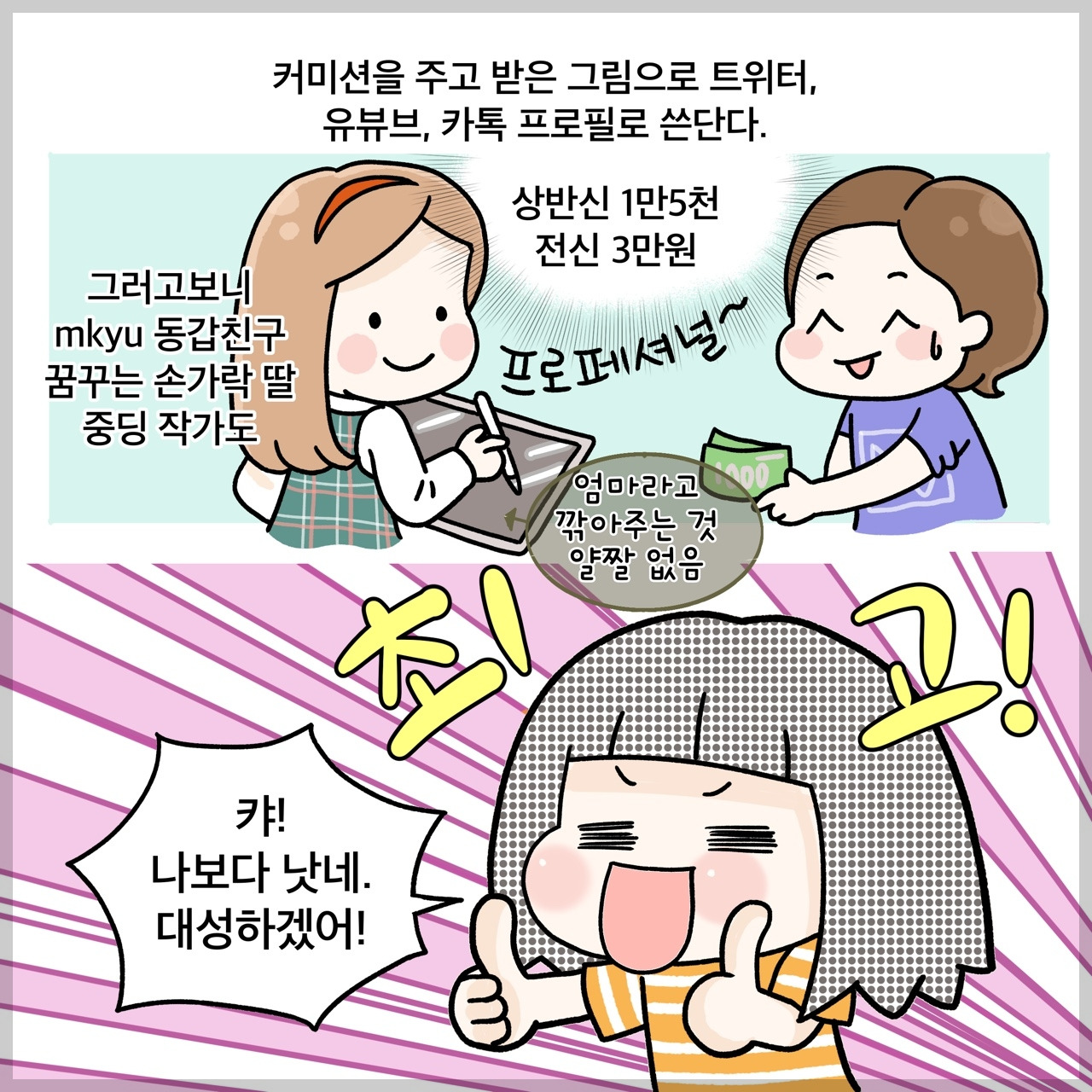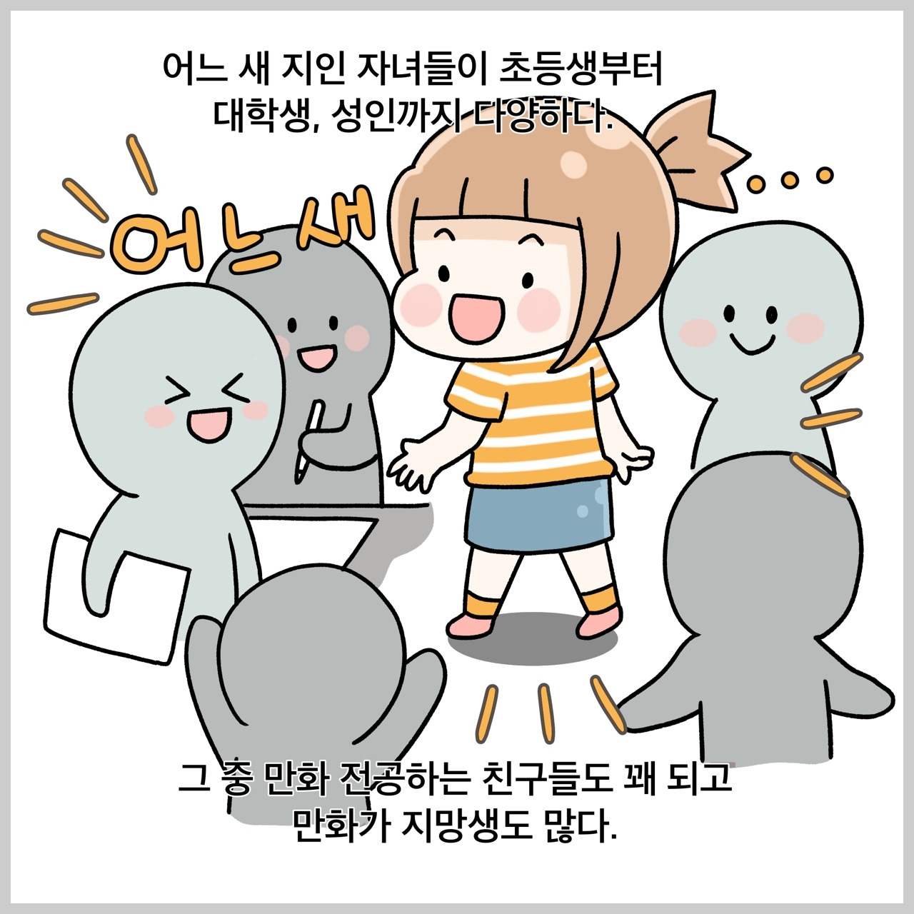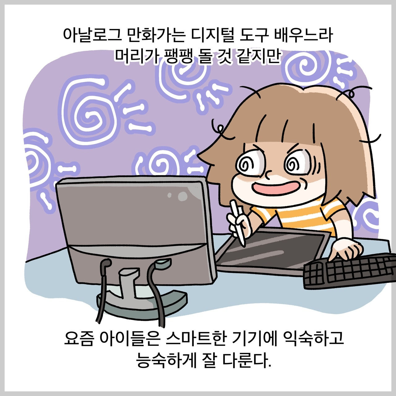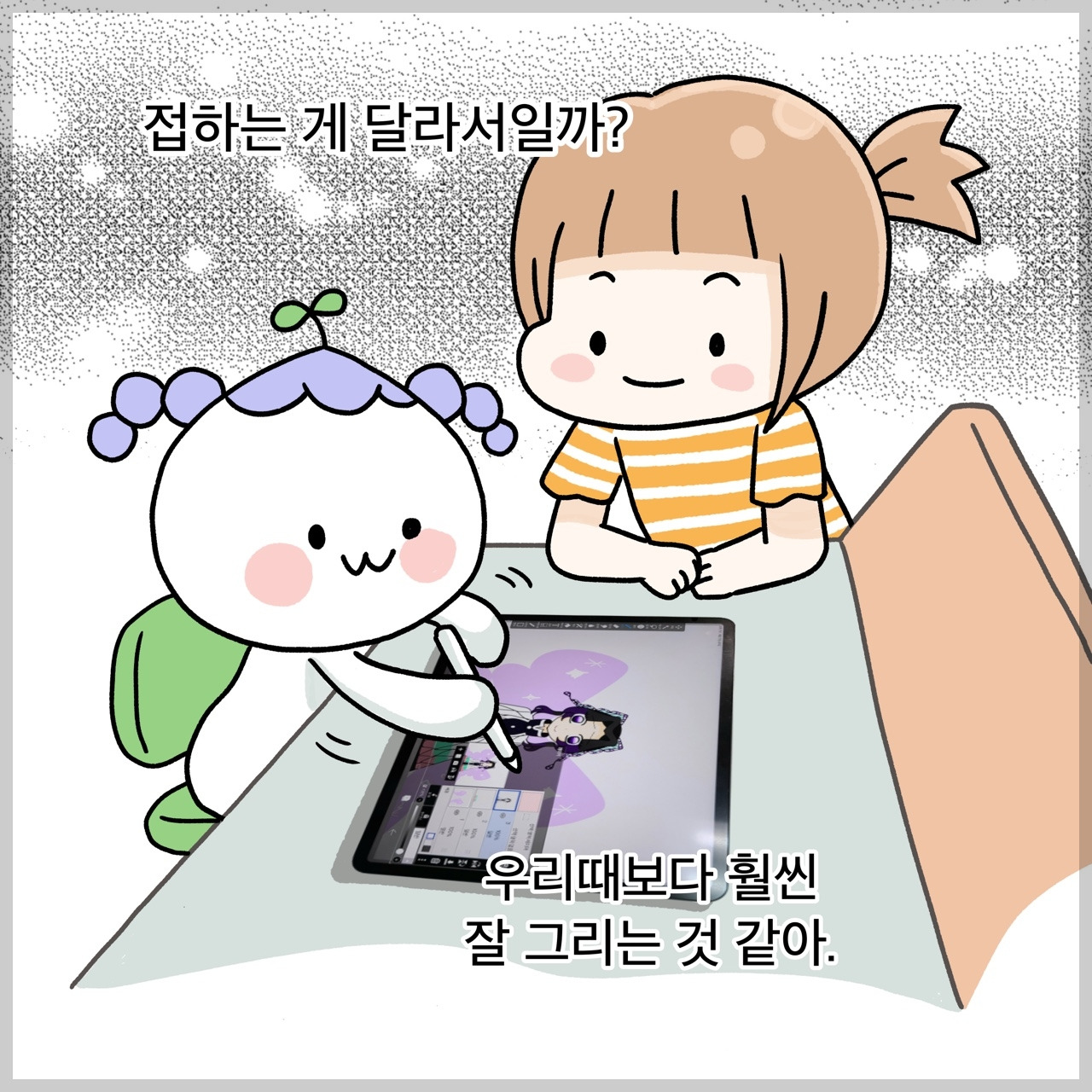 그림쟁이로 돌아와 따져봐도 생각도 그림스타일도 세대 간에 달라지는 것은 어쩔 수 없다. 보고 자란 만화가 다르고 그림을 그렸던 방식, 스타일이 다르다. 아이들은 내게 요즘 트렌드한 그림체로 그려보라고 한다. 그림 스타일을 흉내 낸다고 이들의 필까지 따라갈 수 있을까? 요즘 유행과 트렌드를 챙기면서 감이 떨어지지 않게 하는 것도 중요하지만 결국 사람은 본인이 좋아하는 것에 끌리게 되어 있다. 나는 이런저런 말을 들어도 고집스레 내가 좋아하는 스타일의 그림을 그려가고 있다.
