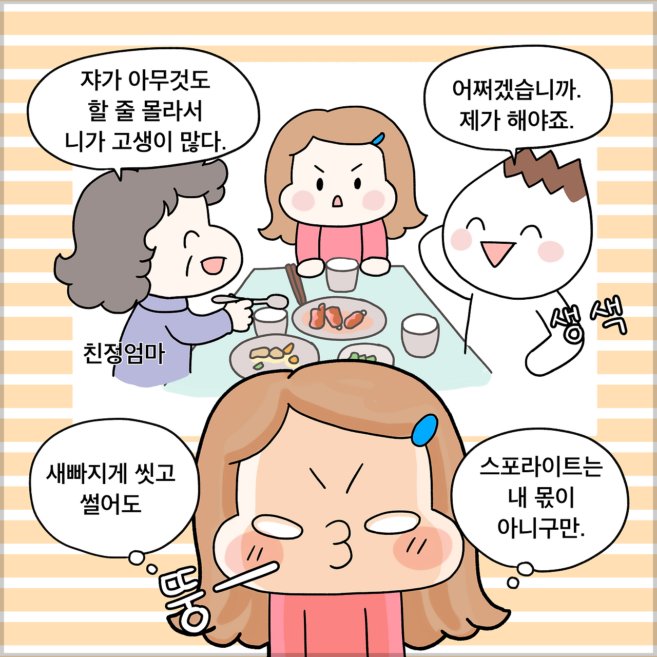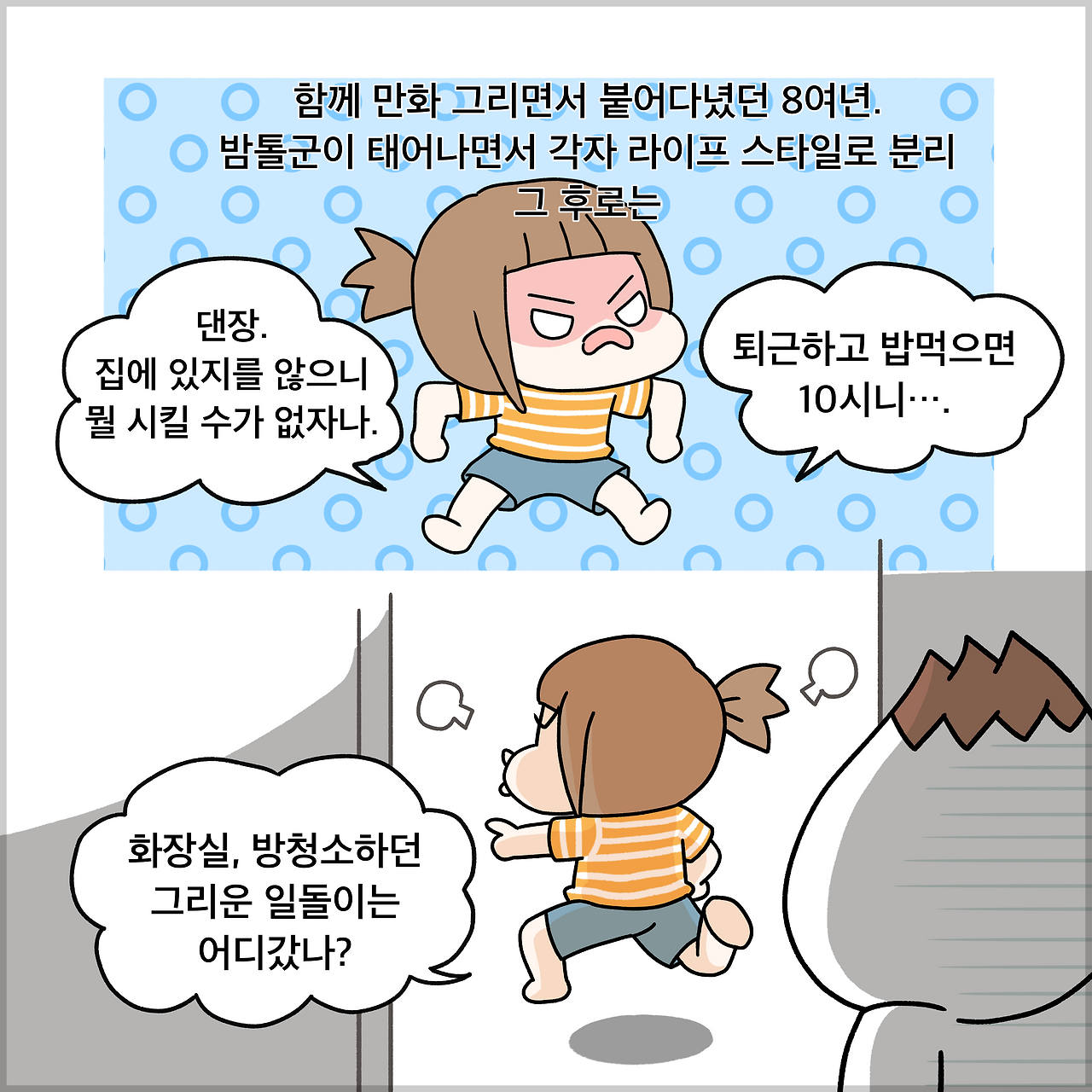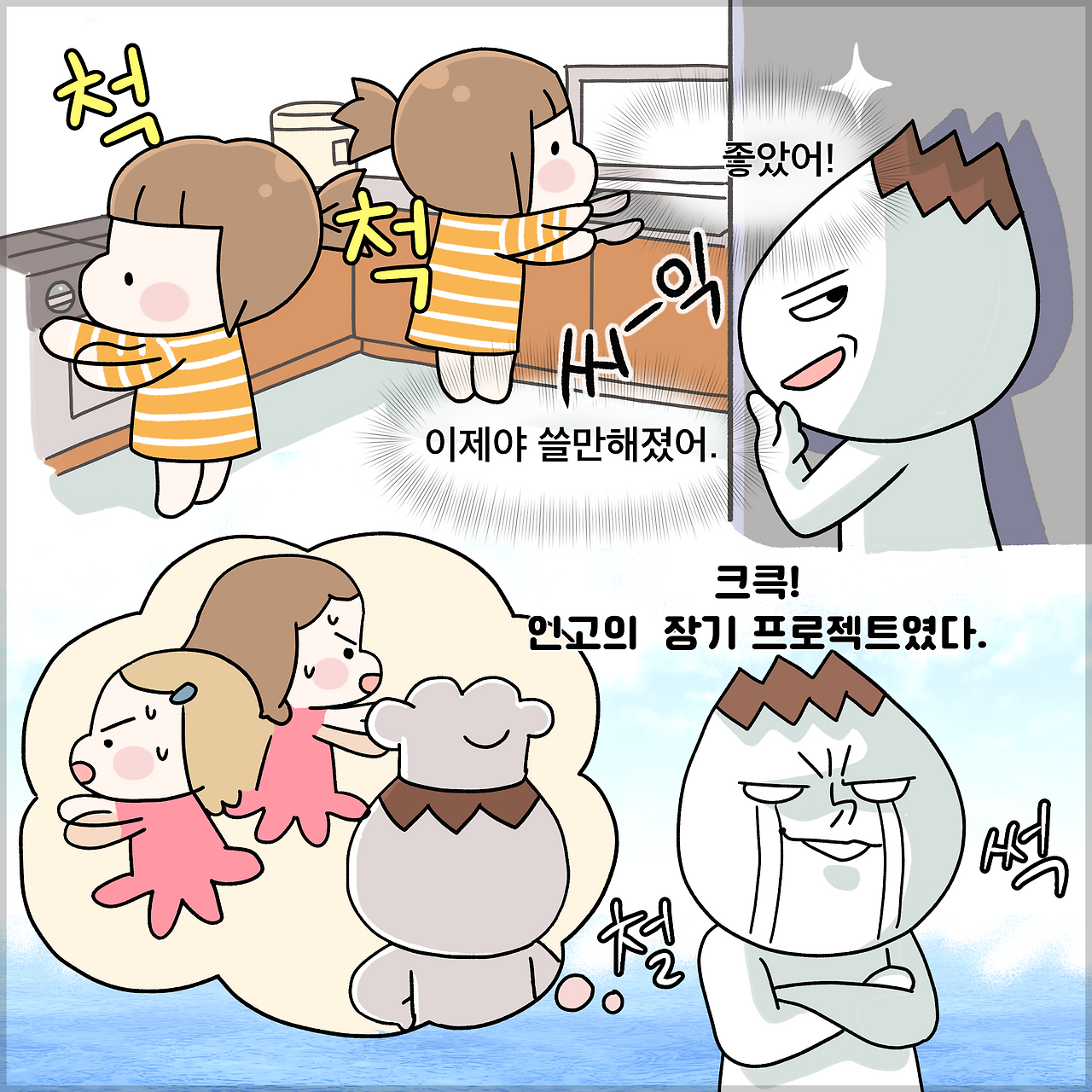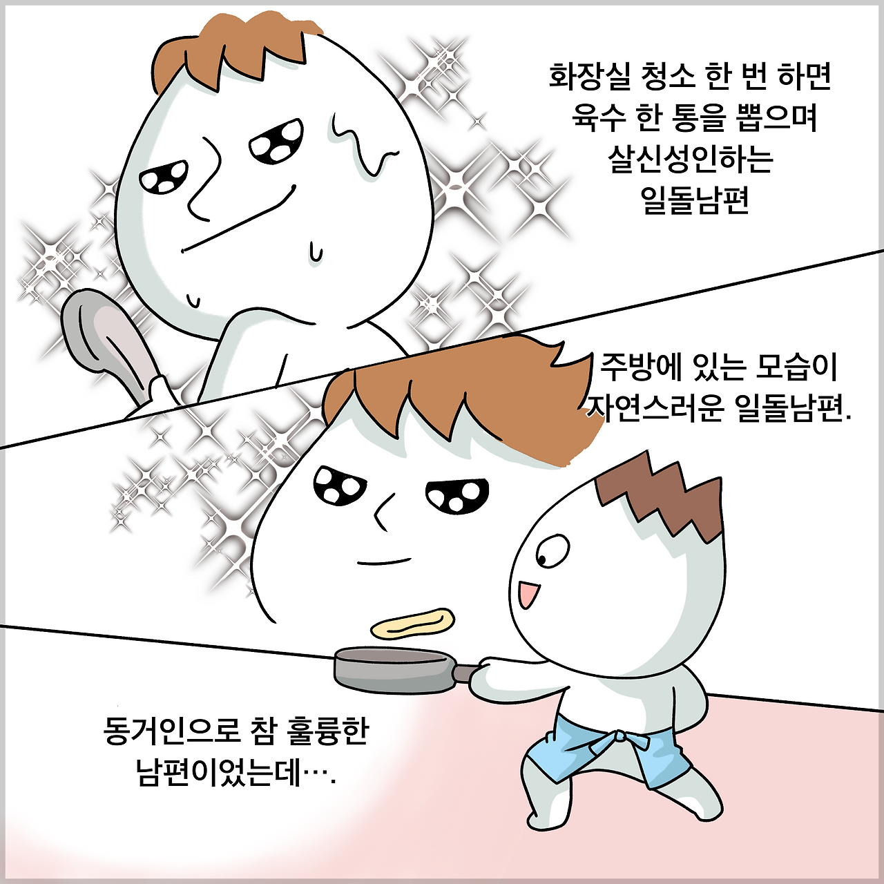 그런데 인식하지 못하는 사이 아주 조금씩 일돌 남편은 집안 살림에서 발을 빼고 있었다. 언젠가부터 화장실 청소를 안 하더니 바쁘다며 방청소를 손 놨다. 그리고 요리하는 횟수도 많이 줄었다. 결혼 24년 차 현재 남편은 아침에 출근했다 9시에 퇴근해서 밥 먹고 겨우 밥그릇 담그는 평범한 남편이 되어 있었다. 나 어쩐지 조련당한 기분이네.