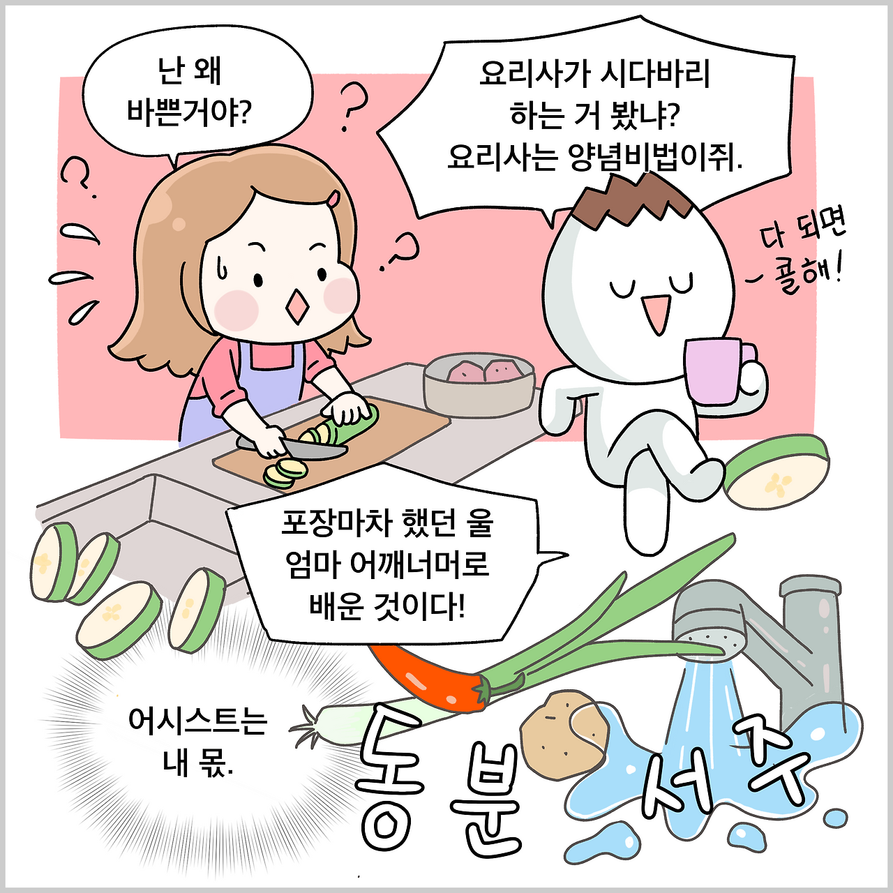 일돌 남편은 요리는 곧잘 하는데 설거지는 귀찮아한다. 칼질도 싫어한다. 씻고 데치고 써느라 몇 배의 시간을 고생하고 뒷설거지를 하다 보면 생색내는 남편이 얄미울 때가 있다. 식당 주방에서 초짜가 허드렛일을 다하고 나중에 주방장이 와서 휘리릭 짧은 요리를 완성해 내면 모든 찬사는 주방장이 받는단 말이지.