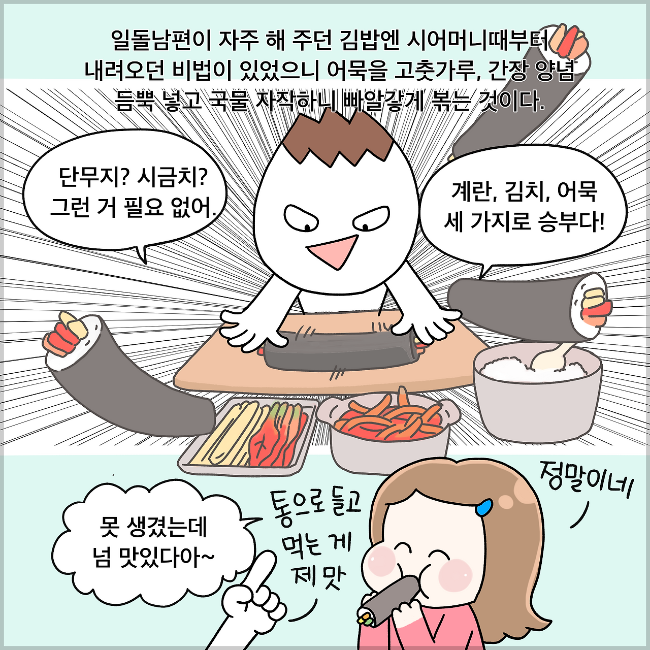"얘가 뭘 모르네. 무침, 볶음 맛없게 하는 사람도 얼마나 많은데. 입 짧은 내가 맛있다고 하면 잘하는 거야."