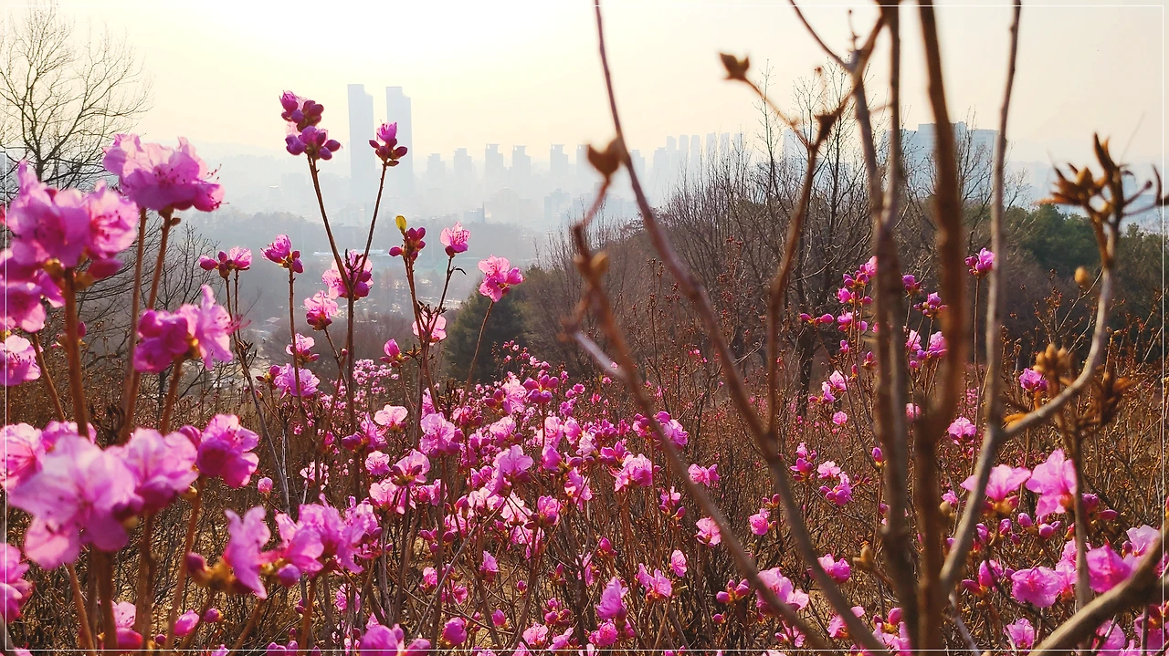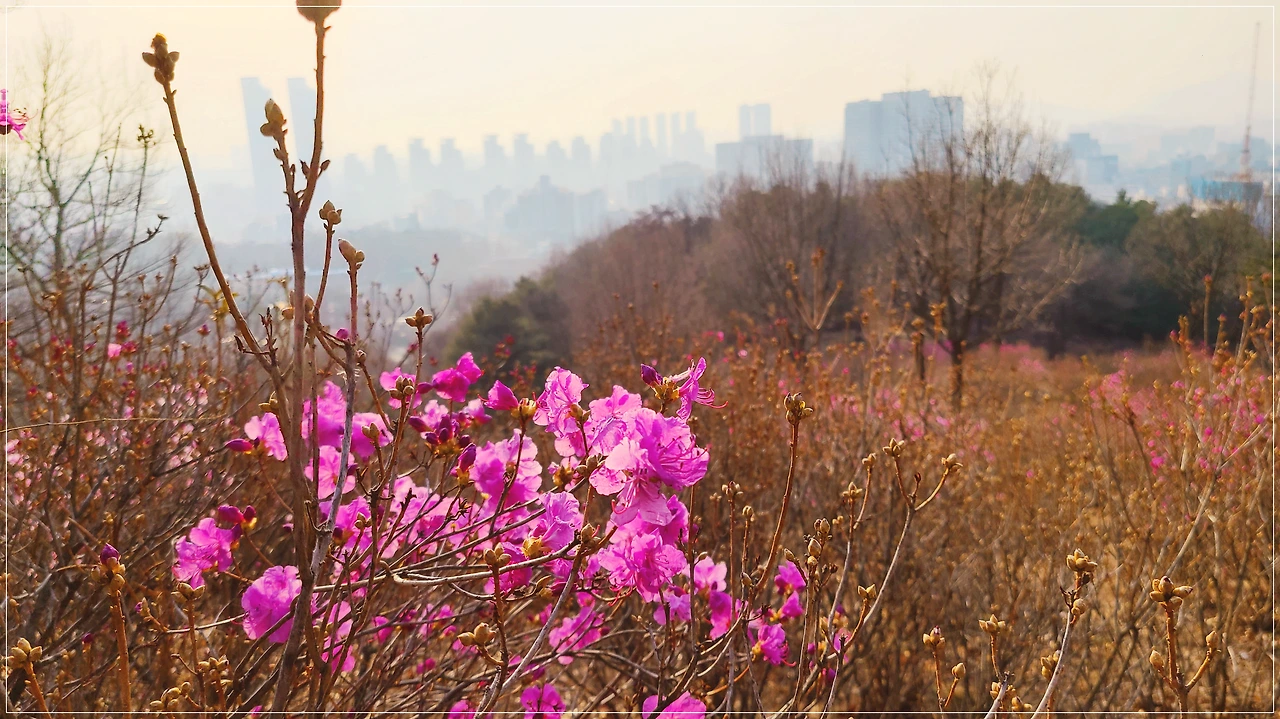 도서관에 오는 것도 일정에 없었는데 갑자기 산을 오르게 되었다. 사실 원미산에 진달래가 피었는지 궁금하던 참이었다. 원미산 둘레길을 따라 올라가서 정상과 반대인 둘레길 초입으로 방향을 잡고 걸었다. 길 옆으로 진달래 동산으로 내려가는 계단이 보였다. 계단 양쪽으로 경사진 넓은 들판에 진달래가 피었다. 화사하게 만발하진 않았지만 군락을 이루기 시작했다. 기분이 좋아져 폰으로 진달래를 몇 장 찍는다. 충전해서 다행이다.