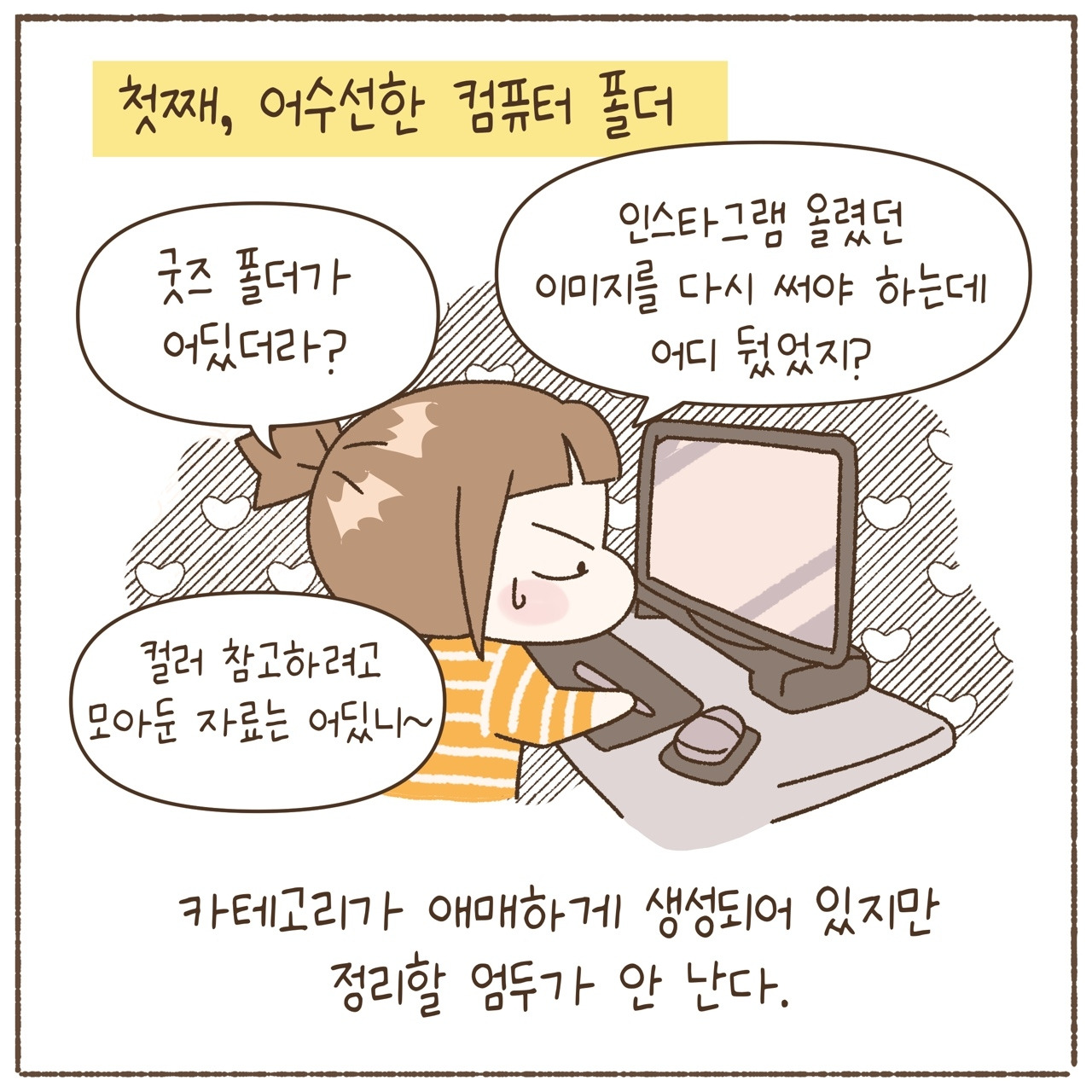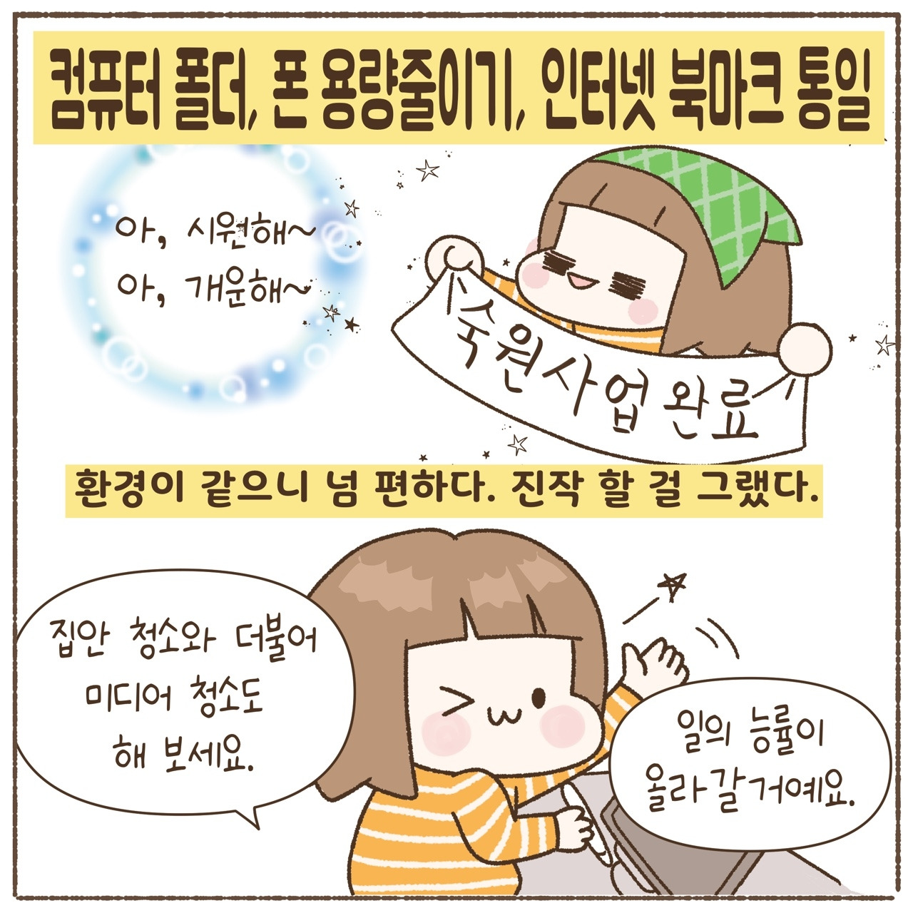 지난 정리 시즌에 디지털 정리를 했었는데 어느새 6개월이 지났다. 컴퓨터 폴더, 폰 용량, 인터넷 북 마크 등 현재 유지 상태를 중간 점검을 해 보니 컴퓨터 폴더는 다행히 우후죽순 쓸데없이 번식하지 않았고 인터넷 북마크도 정리한 카테고리가 익숙해져 검색이 빨라졌다. 문제는 폰 관리다. 작년 이후 사진이며 자료가 또 마구 쌓여있다. 용량이 많이 늘었다. 중간중간 필요 없는 것은 삭제해야 하는데 수신문자, 갤러리, 파일이 많이 차 있다. 혹시 몰라서 놔둔 것들, 1년이 지나도 안 열어보는 것은 버리라고 한다. 폰 파일, 자료도 마찬가지다. 당시에는 영감이 반짝였으나 지금은 있는지도 까먹은 이미지, 자료가 대부분이다. 기록을 하고 잊어먹으면 아무 도움이 안 된다. 다시 들여다보고 기억하고 연결하고 써먹어야 한다.