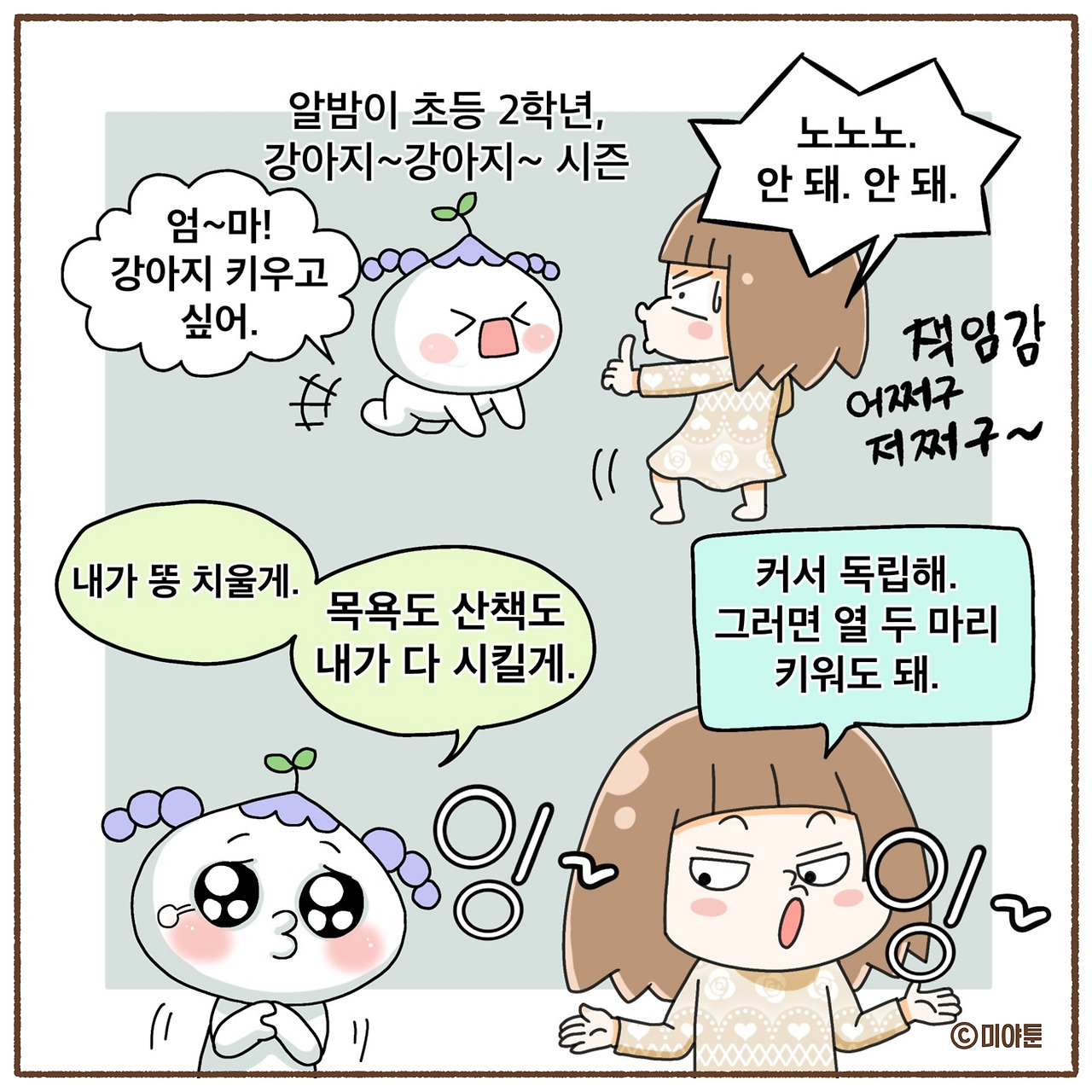 애완동물을 끝까지 책임지지 않았던 죄책감이 마음에 남았다. 생명을 기른다는 것은 이쁠 때만 들여다보는 게 아니라 끝까지 함께하고 책임지는 거라는 것을 무겁게 깨달았다. 그러다 아이들 강아지 시즌이 되니 조금 흔들렸다. 며칠 쿠키를 데리고 있으니 진짜 예뻤다. 하지만 예쁘다고 덥석 데려오기에는 잘못한 게 너무 많았다. 애완동물을 키우기 전에 대상에 대해 공부하고 충분히 준비를 하고 맞이해야 한다는 걸 너무 늦게 배웠다.
